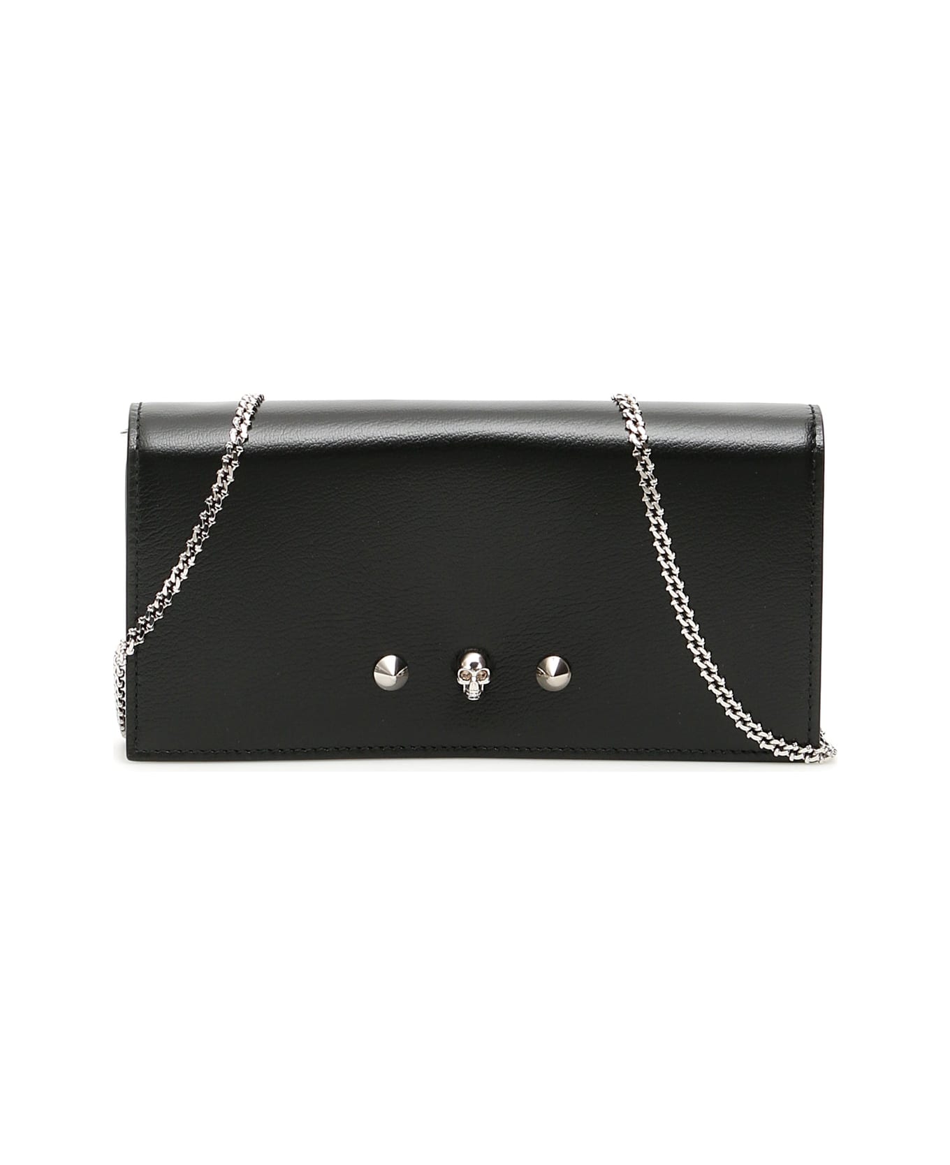 Alexander McQueen leather mini bag with cone studs and Skull on the front. It features a removable chain strap and snap-button flap. Bicolor leather lining, two gusseted compartments, one zip pocket, one slit pocket, six credit card slots. Silver-tone hardware.