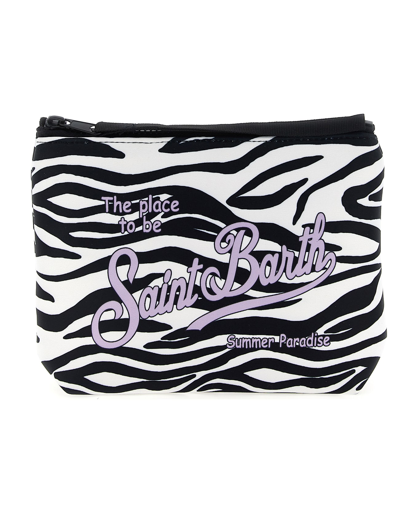 'Aline' clutch bag in all-over zebra print scuba fabric, top zip closure, wrist handle. Composition: 80% sbr, 20% polyester