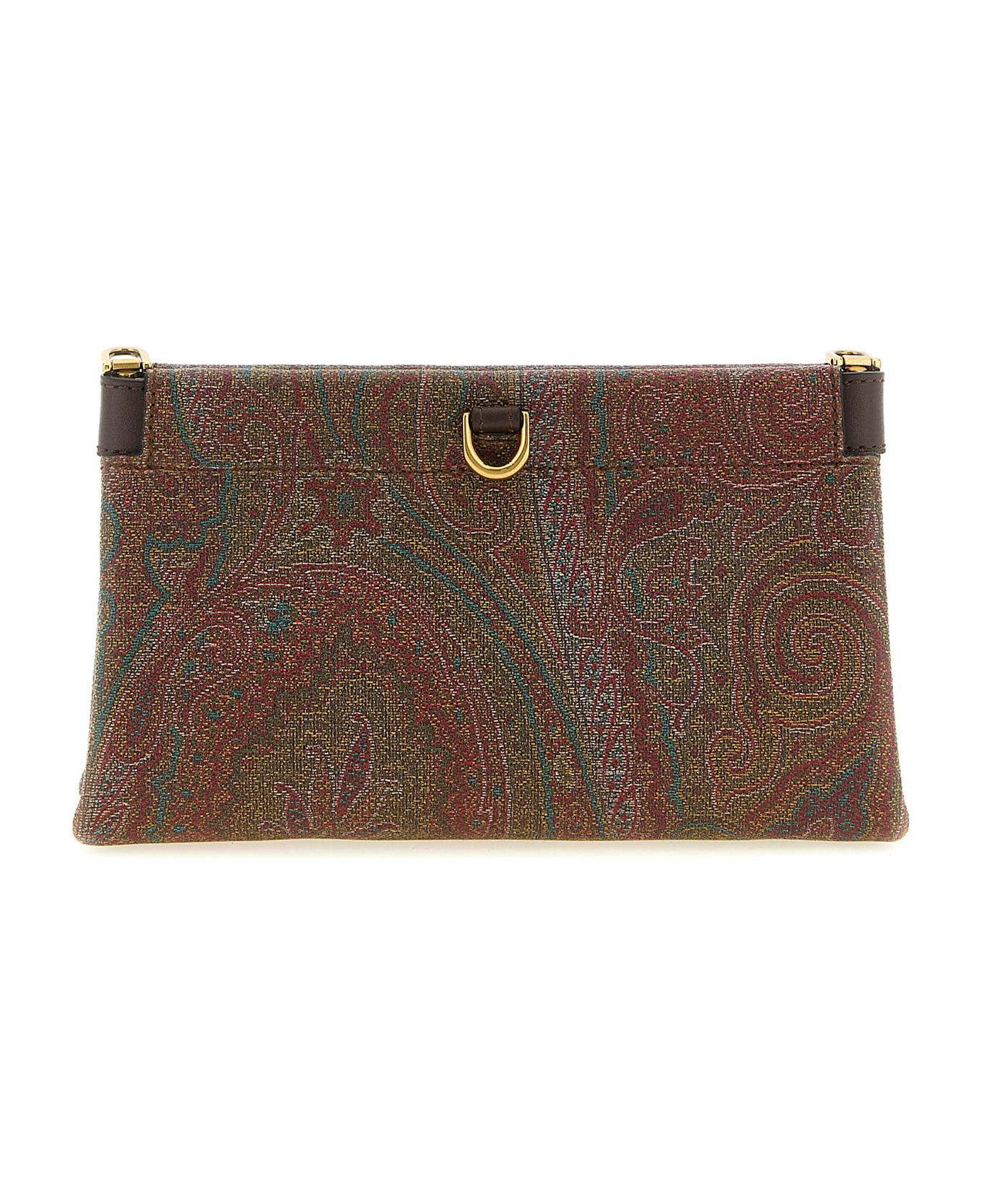 Paisley jacquard canvas 'Arnica' clutch bag with leather details, snap metal band closure, removable chain shoulder strap.