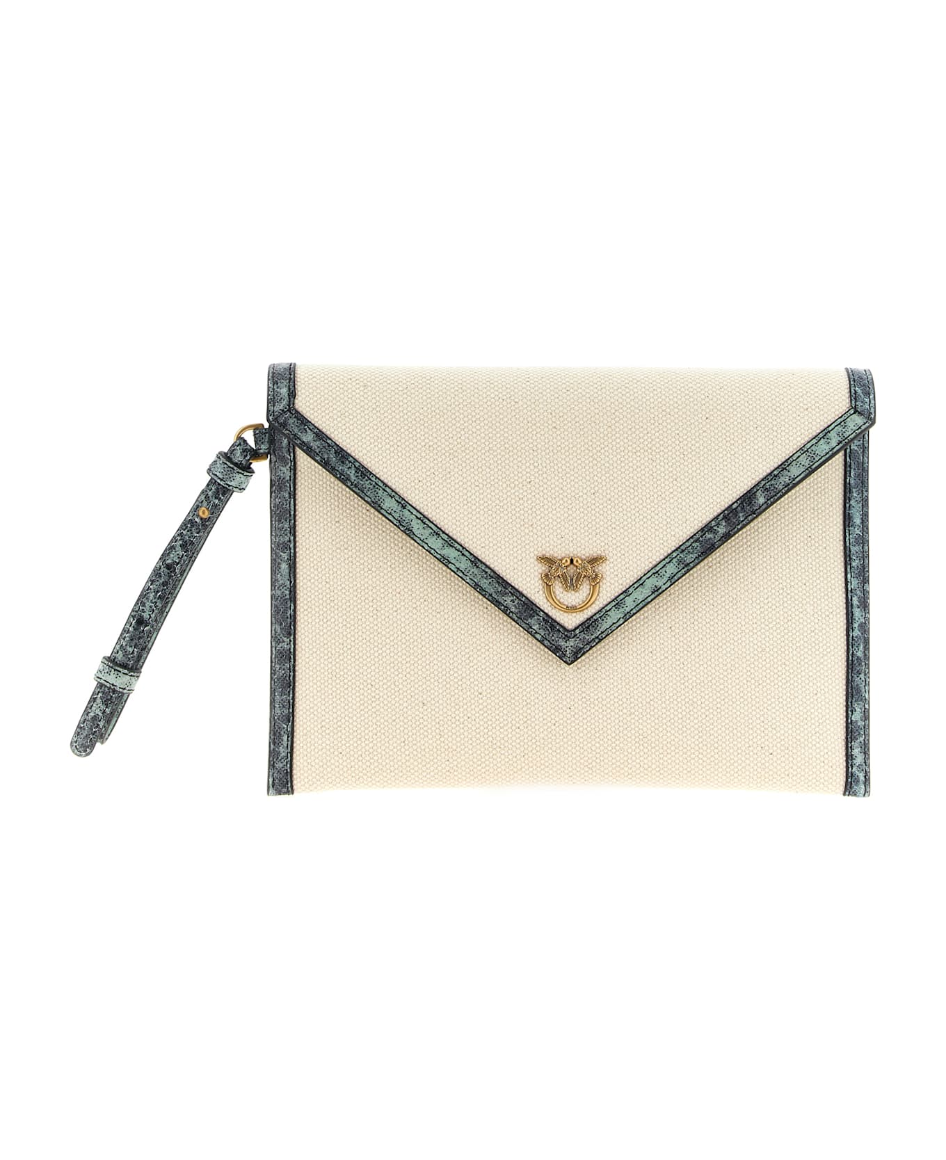 Flat clutch bag in quilted cotton canvas with pointed chevron pattern, contrasting lizard-print leather piping, envelope design with magnetic flap closure and metal 'Love Birds' logo applied on the front, cotton lining, adjustable and removable leather wristlet strap.