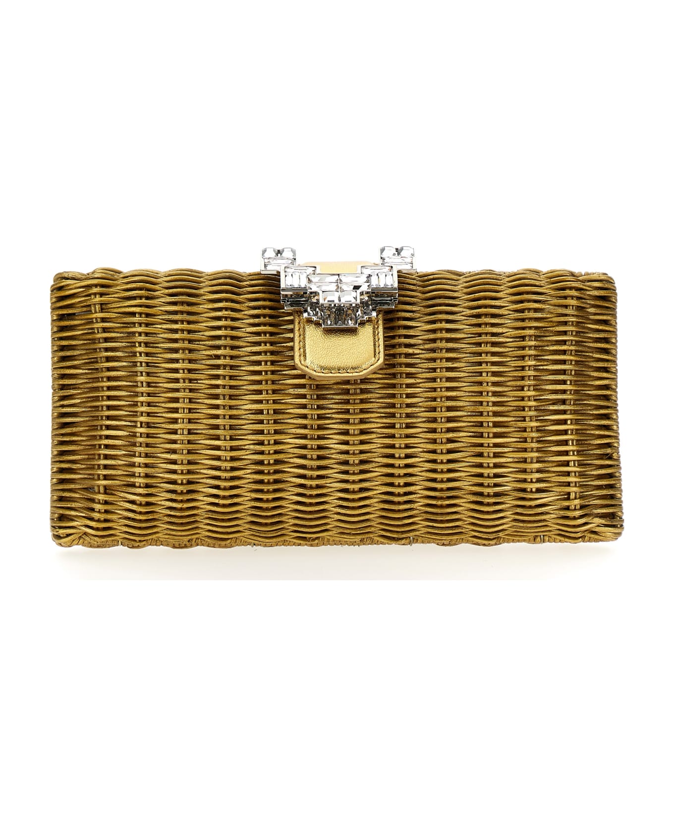 Porcelain clutch bag with jewel buckle closure and a removable chain.