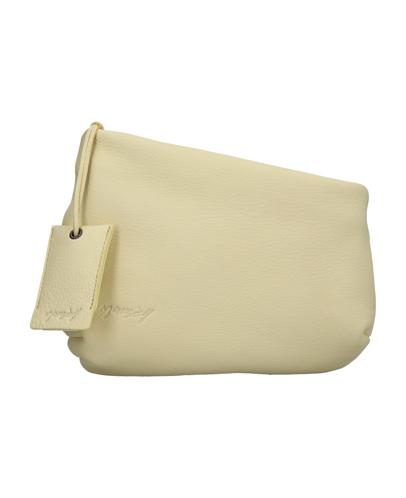 Fantasmino' leather pouch with zip and wristlet closure and an inner adjustable and removable shoulder strap.