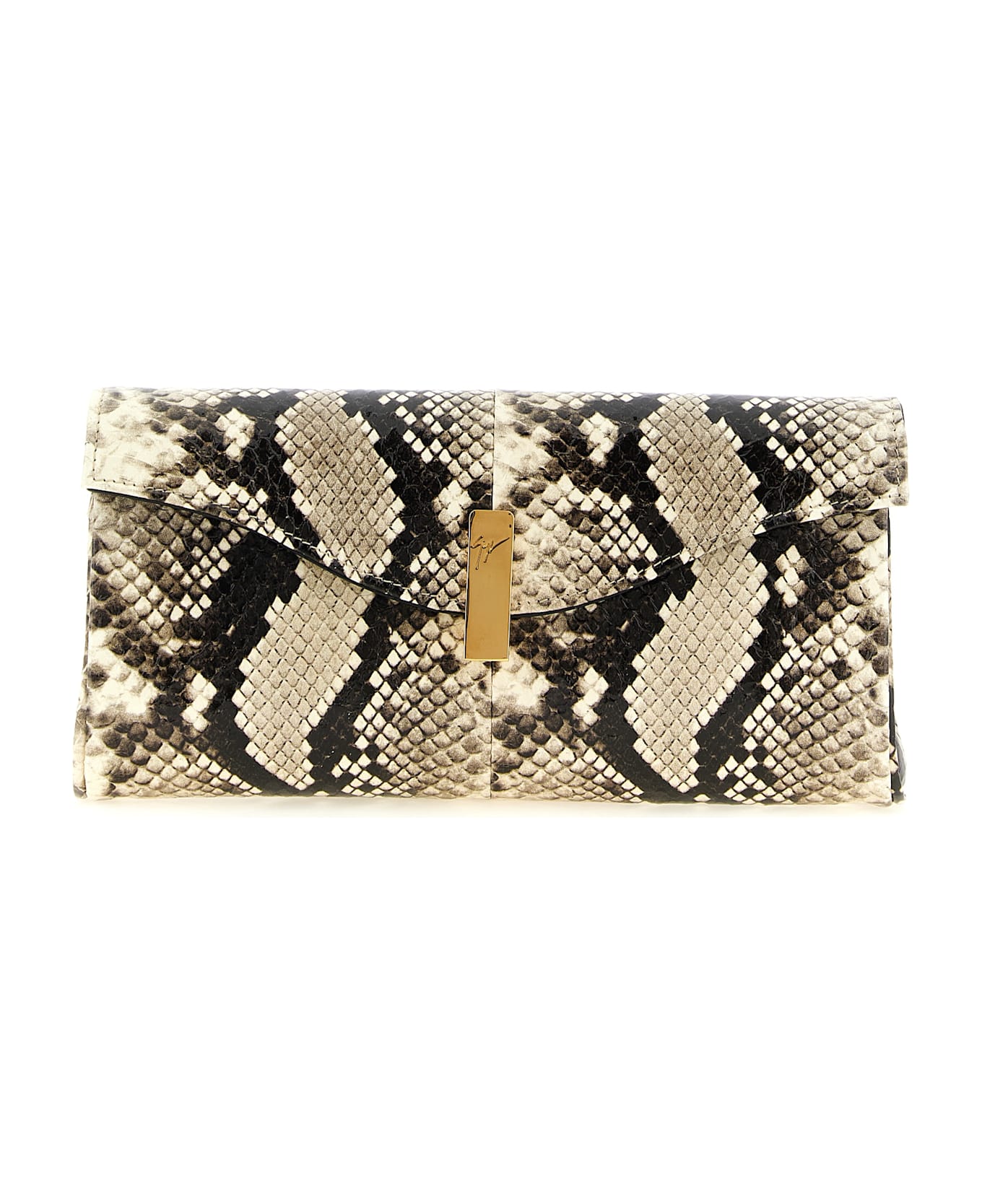 'Flutie' python print leather clutch with gold metal logo closure, removable chain shoulder strap, inner card pocket.