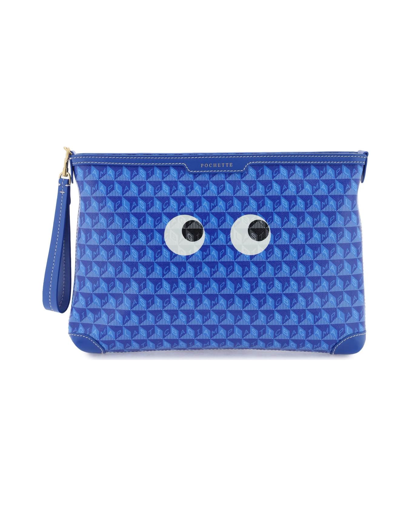 Anya Hindmarch pouch made of cotton canvas-effect fabric, obtained from recycled plastic bottles, with leather trims and contrasting topstitching. Design decorated with all-over lettering pattern and Eyes print at front, featuring zipper closure, unlined interior with one open pocket, three card slots and removable leather wrist handle. Gold-finish metalware.