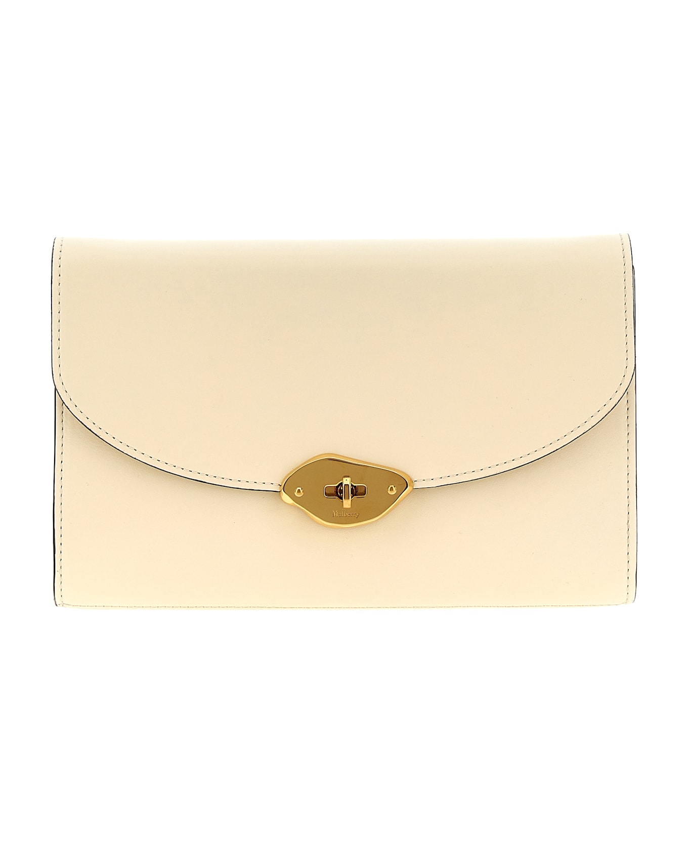 'Lana' smooth leather clutch, flap closure with metal Foundry Lock, removable chain shoulder strap.
