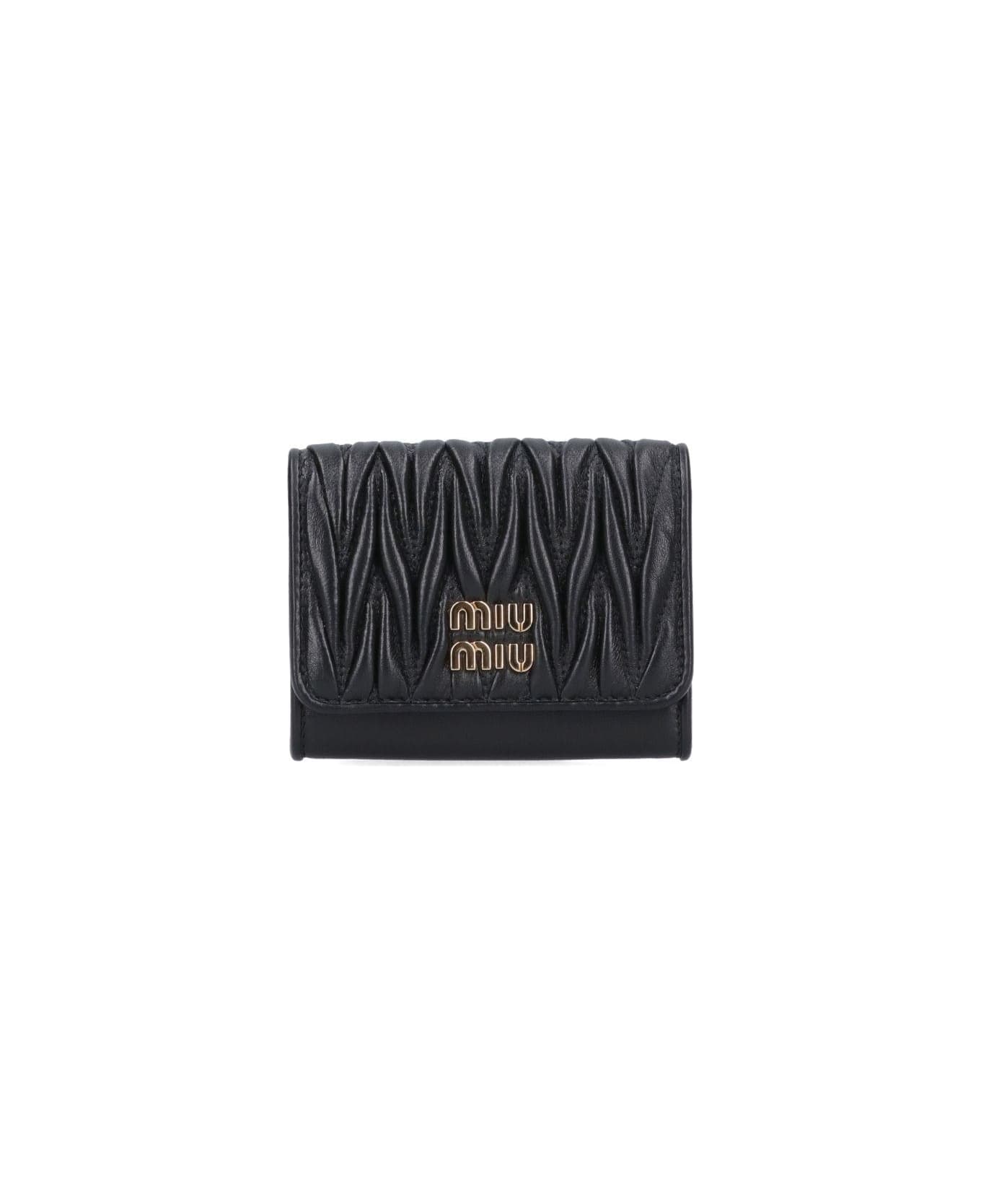 Miu Miu Logo Card Case, metallic quilted nappa leather, black colour, metal lettering logo on front, snap fastener, four card slots, one outside pocket, gold hardware.