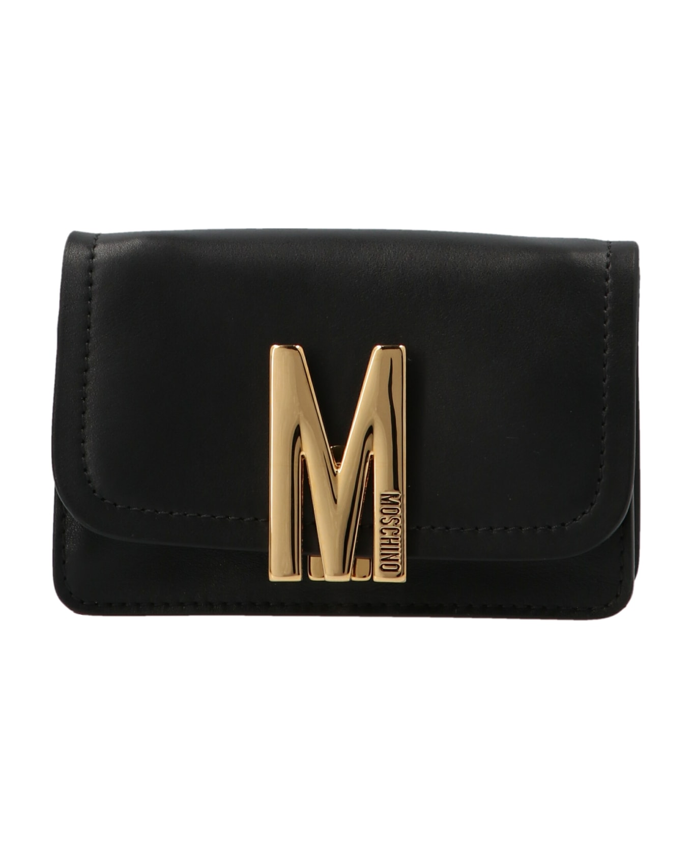 Moschino 'M' mini leather clutch bag with a logo appliqué and a wristlet. Composition: 100% calfskin leather