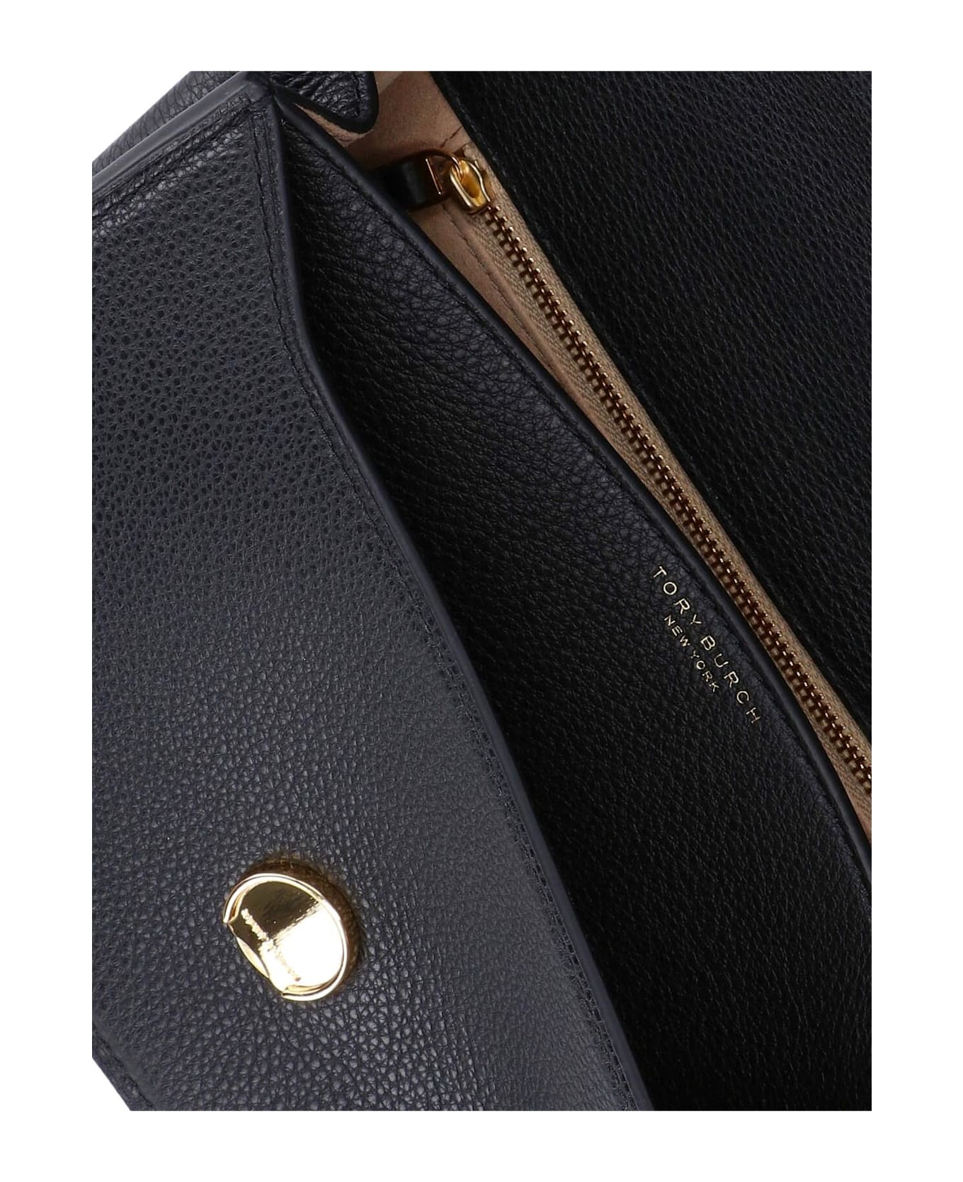 Tory Burch 'Miller' shoulder bag in black hammered leather with adjustable shoulder strap, back slip pocket, magnetic flap closure, gold metal double 'T' logo buckle detail, main inner compartment, inner zip pocket, inner flat pocket.