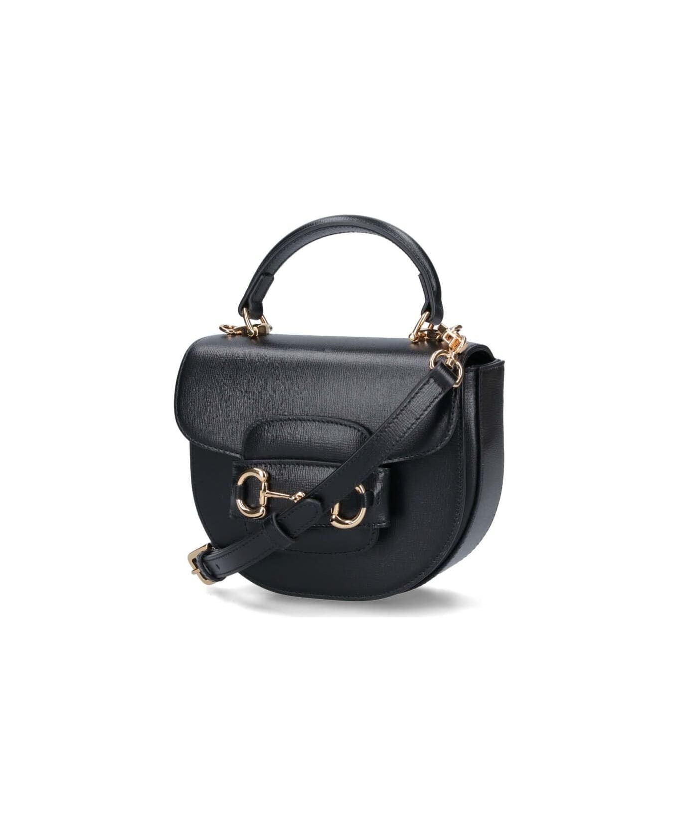 Gucci mini Horsebit 1955 bag in black hammered leather with rigid top handle, removable shoulder strap, spring flap closure, gold metal Horsebit Clamp detail, two separate interior compartments, and interior card slot.