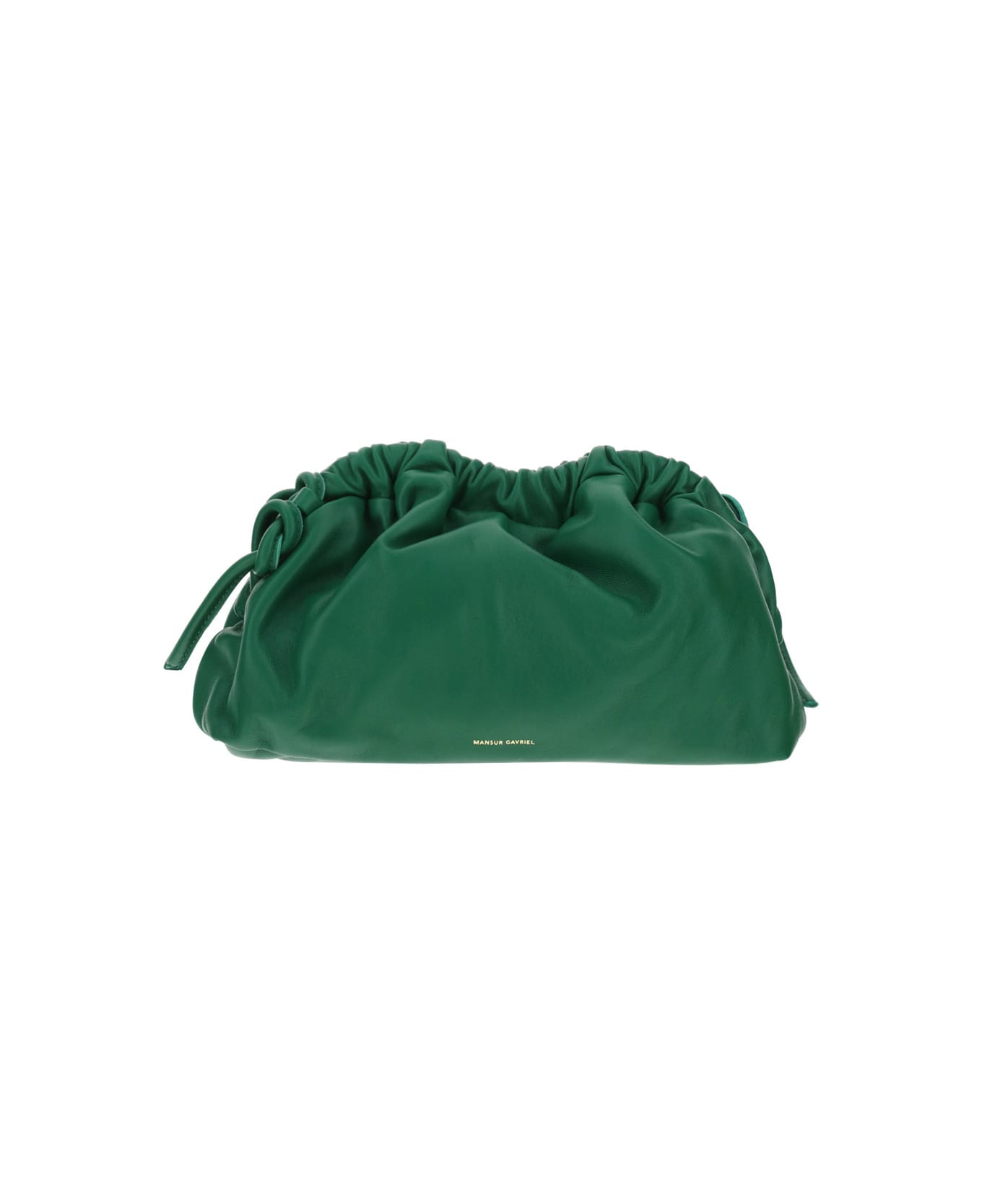 Lambskin mini cloud clutch by mansur grivel, curved frame with magnetic closure, adjustable leather shoulder strap, contrasting brand logo on front, contrasting interior lining.