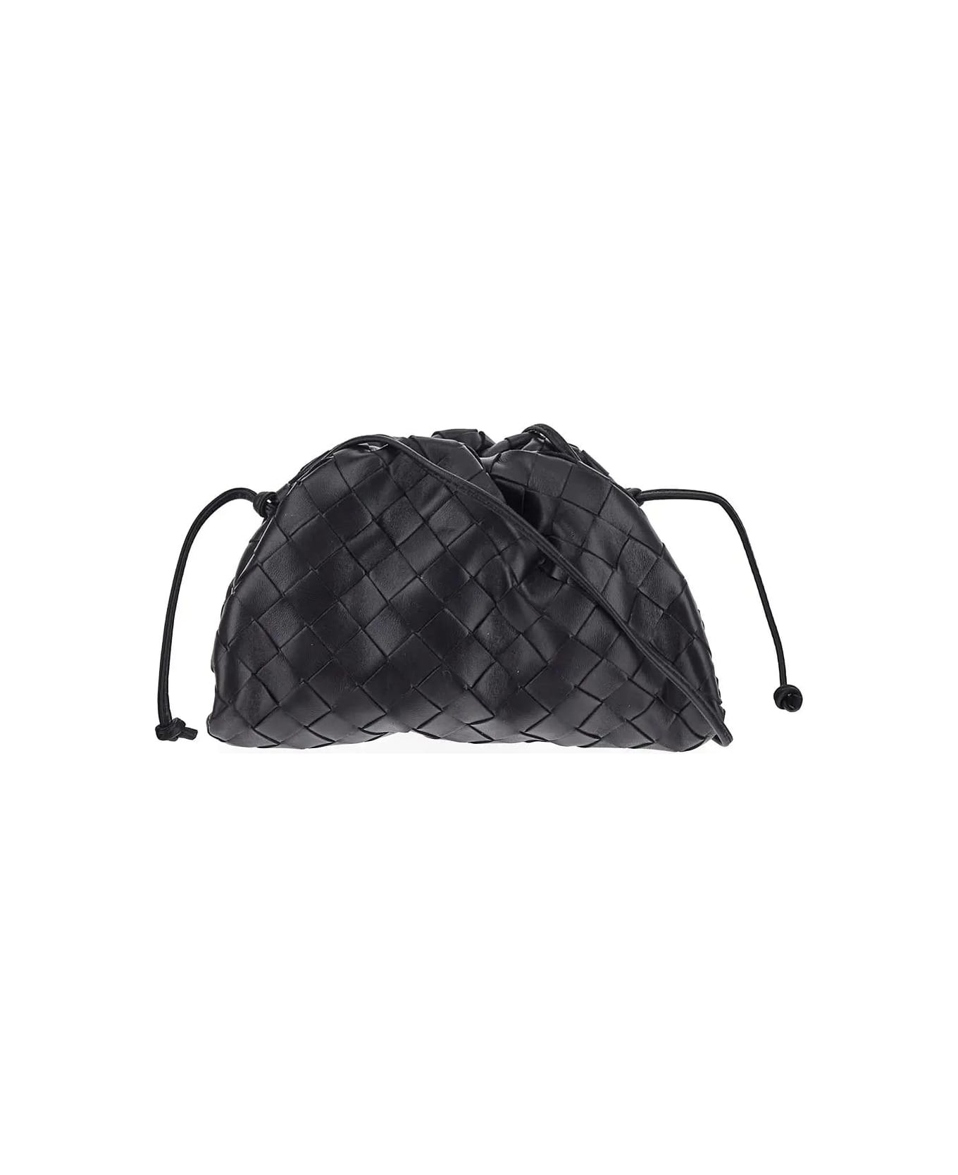 Bottega Veneta mini pouch in black leather with Intreccio design, magnetic frame closure, slim shoulder strap and silver-finish hardware.