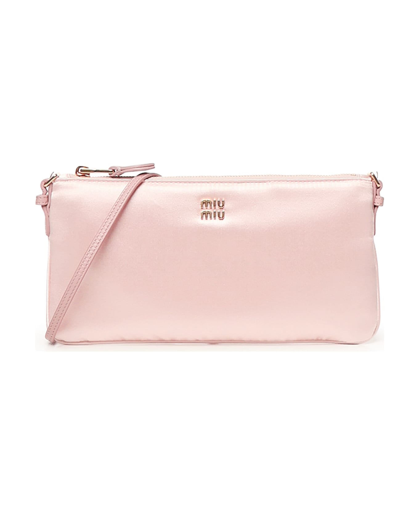 -Zip closure -Adjustable and removable leather shoulder strap -Duchesse interior with card holder pocket -Metal lettering logo -Measurements; 11. 5 x 22. 5 cm -Made in Italy -Color: Pink Composition: 72% Viscose, 28% Silk