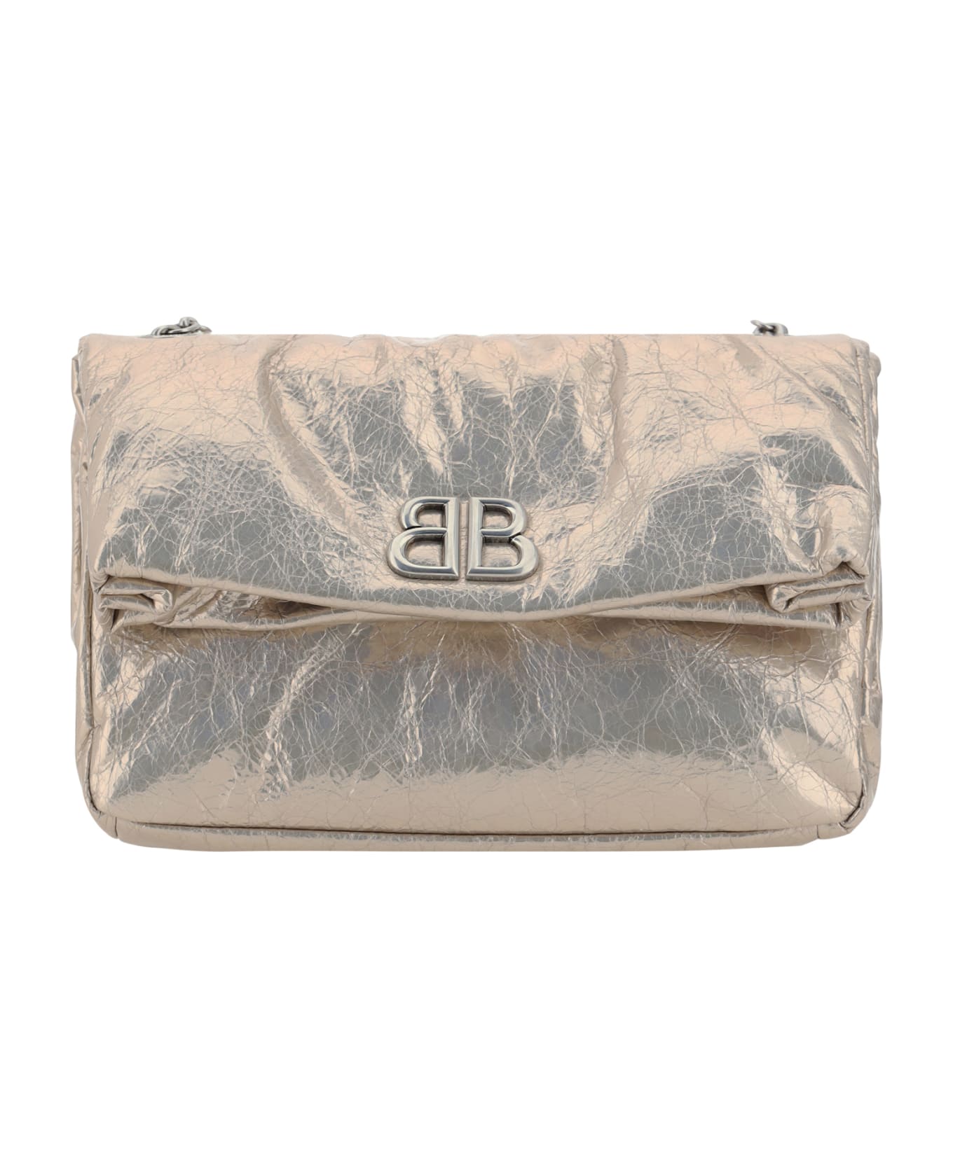 Calfskin monaco shoulder bag by balenciaga, sliding chain handle, crinkle-effect metallic leather design, front magnetic flap closure, single interior compartment, three-dimensional iconic brand logo plaque applied to front.