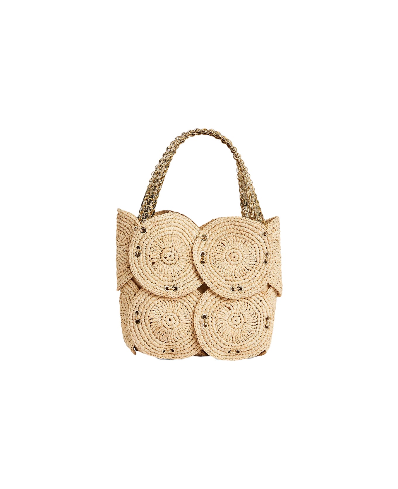 Paco Rabanne small handbag made with natural raffia discs and 240 metal eyelets with a light gold finish. Model features a single interior compartment, an interior flat pocket and a design without clasps. Paco Rabanne medals hang from the strap made from the iconic 1969 chips.