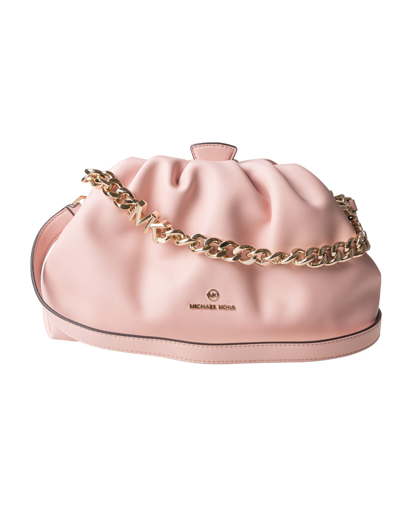 Michael Kors Nola balloon clutch bag, in leather. Gold-colored metal closure. Detachable handle consisting of gold-colored chain links and logo emblem with snap hooks (approx. 48 cm). Detachable and adjustable leather shoulder strap with snap hooks (approx. 103-121 cm). Gold-colored metal logo on the front. Beige fabric lining with logo motif. Inside zip pocket and one open pocket. Logo Plate in internal leather. Dimensions: 29cm x 19cm x 9cm. Composition: 100% leather. Made in China.