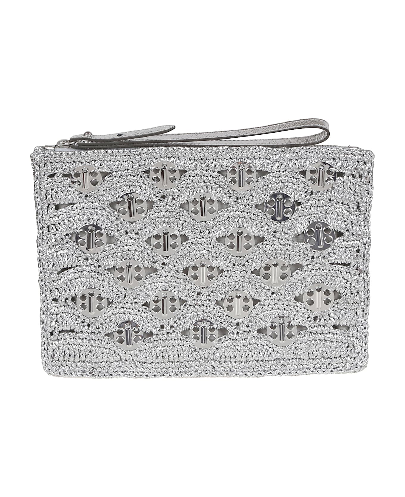 PACO RABANNE lurex raffia bag. Zip closure; fabric pocket; silver leather strap for carrying by hand. Features iconic 1969 records allover.