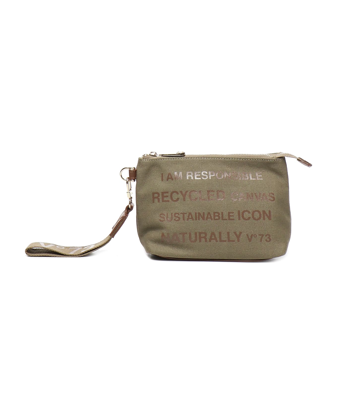 -Made of canvas -Zip closure -Wrist strap -Double portability: by hand or shoulder -One main compartment with zip -Contrasting logo -Dimensions: 21x 15 x 9. 5 cm -Color: Taupe