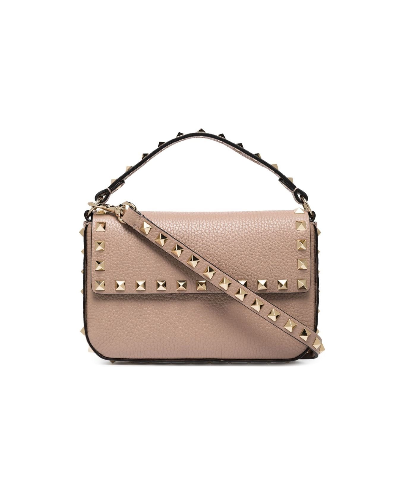 Valentino bag beige leather gold-tone Rockstud embellishment single rounded top handle logo stamp to the rear front flap closure concealed magnetic fastening main compartment internal card slots internal logo stamp adjustable detachable shoulder strap The full look includes Valentino Garavani accessories. Composition: Calf Leather, 100%