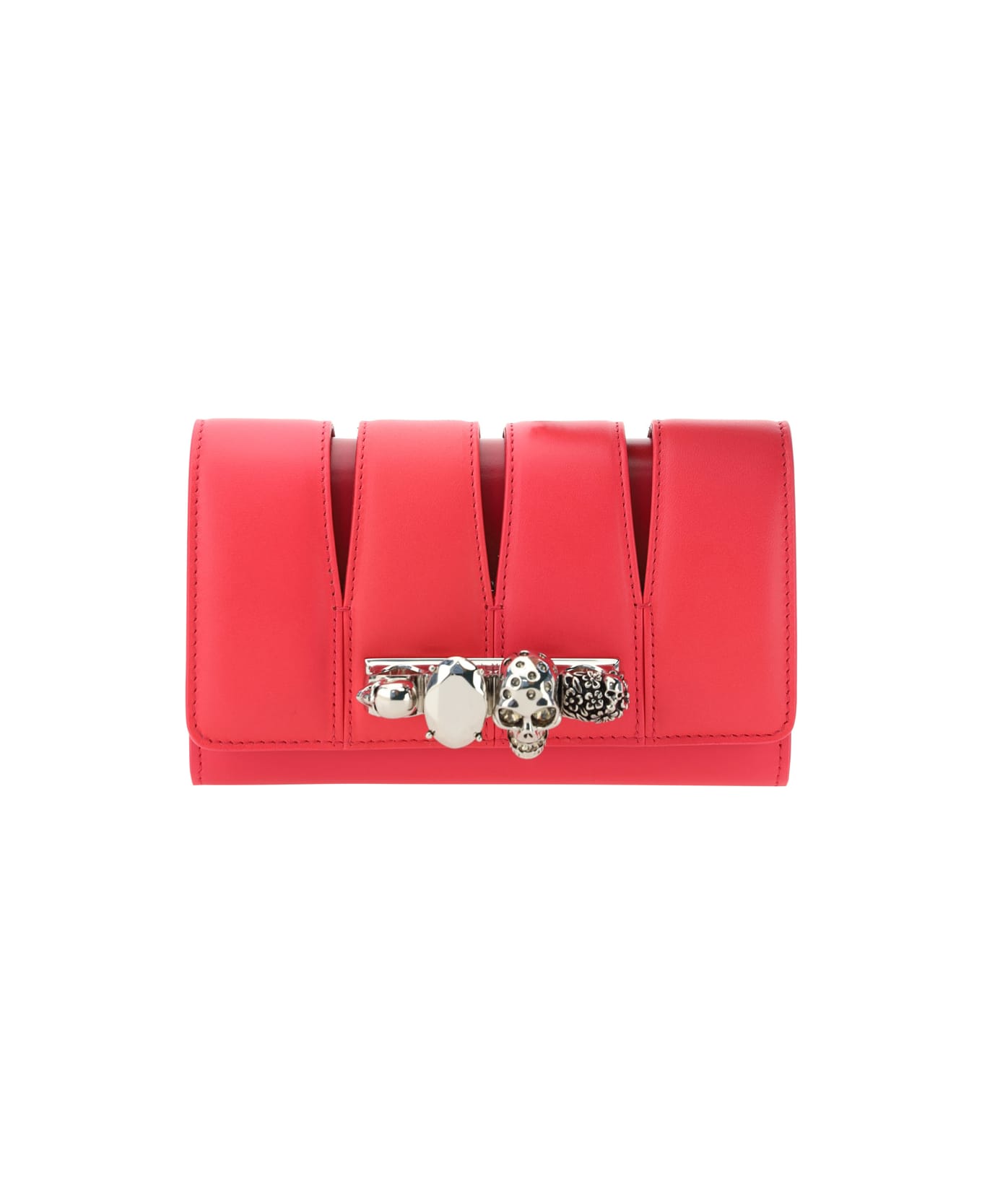 Slash shoulder clutch by alexander mcqueen, all-over padded design, top flap with cut-out details, front flap with magnetic button for closure, single internal compartment, iconic jewel skull handle on the front, removable chain shoulder strap.