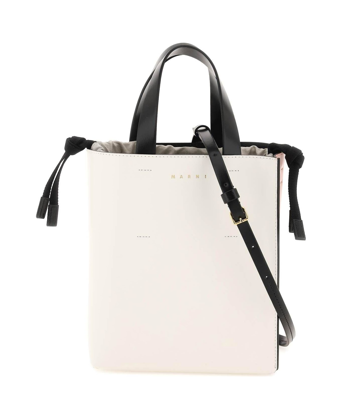 Marni small Museo tote bag in multicolor brushed leather with double handle, adjustable and removable shoulder strap and front gold-tone logo print. Leather interior with one flat pocketa and an independent inner fabric satchel with drawstring closure and one slip pocket. Gold-tone metalware. Composition: 100% Leather 55% Cotton 45% Polyurethane