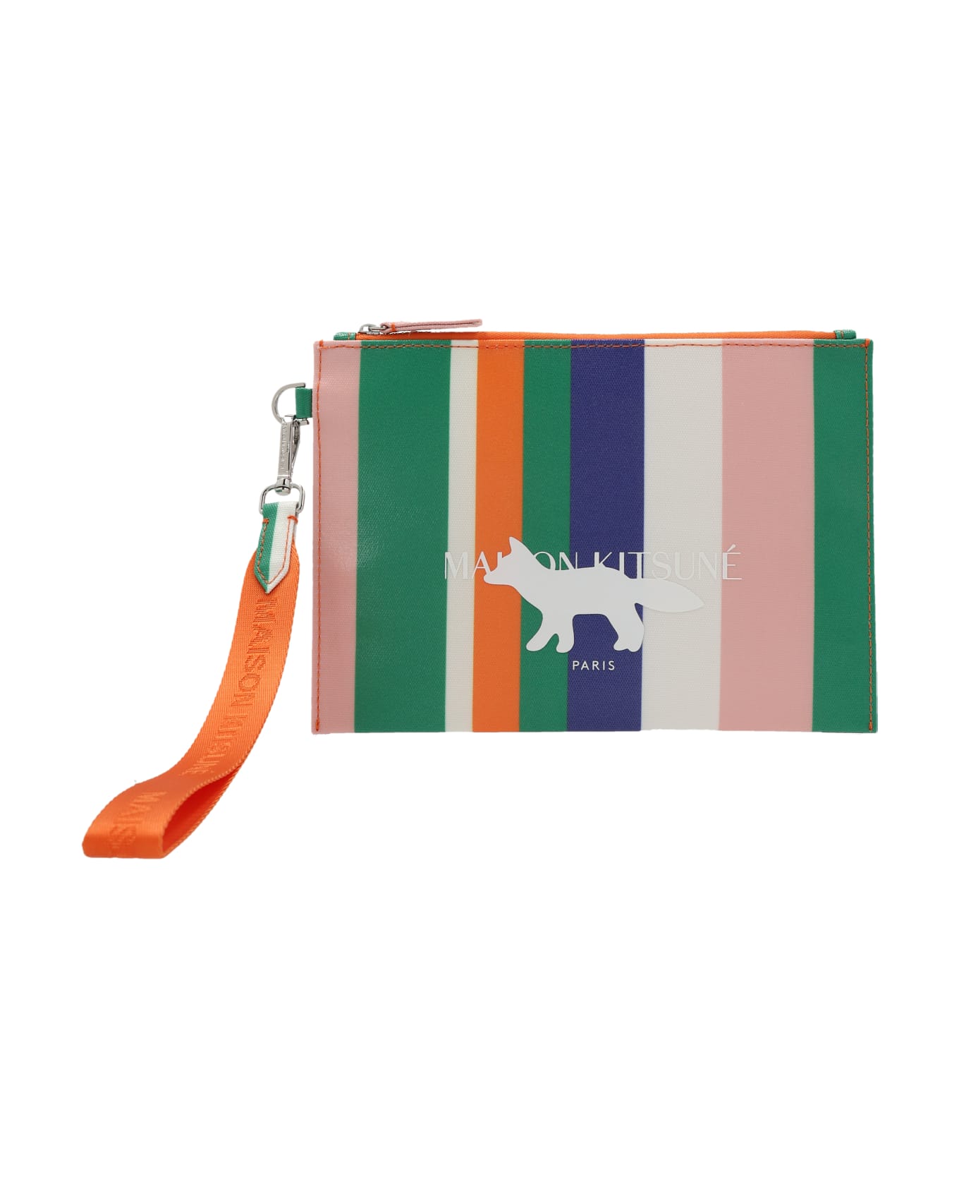 Stripes' multicolor striped canvas clutch, with front logo print, a zip closure, and a removable handle.