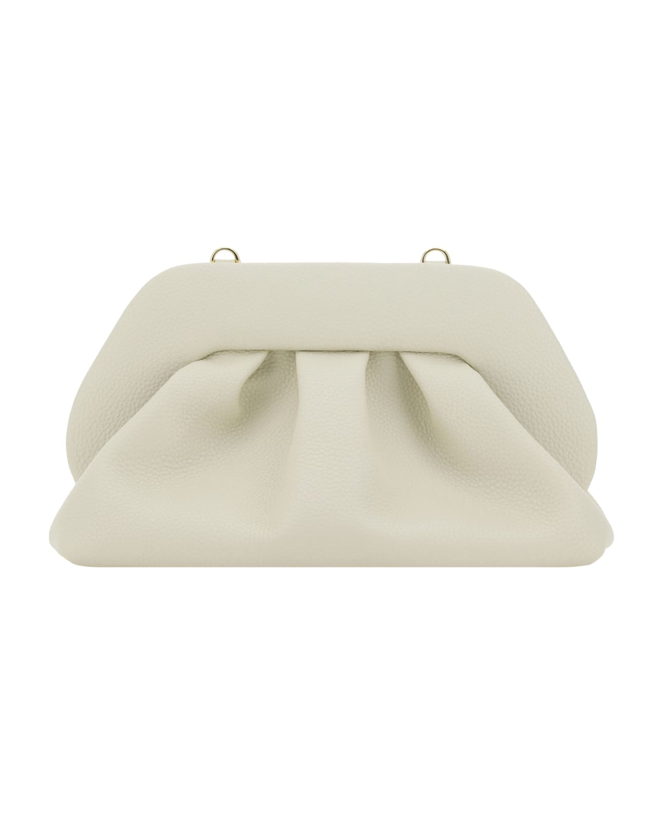 Tia bottalato clutch bag by themoirè, hand carry model, curled design, magnetic snap top closure, removable and adjustable flat vegan leather shoulder strap, recycled fabric interior lining.