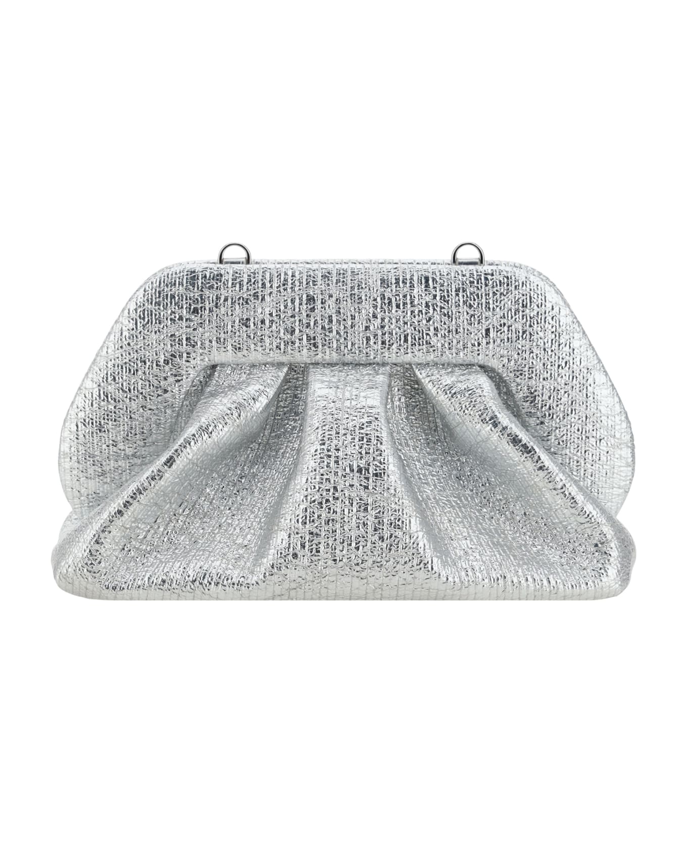 Tia crumpled laminated clutch bag by themoirè, removable and adjustable shoulder strap, magnetic flap closure, metallic geometric design, single interior compartment.