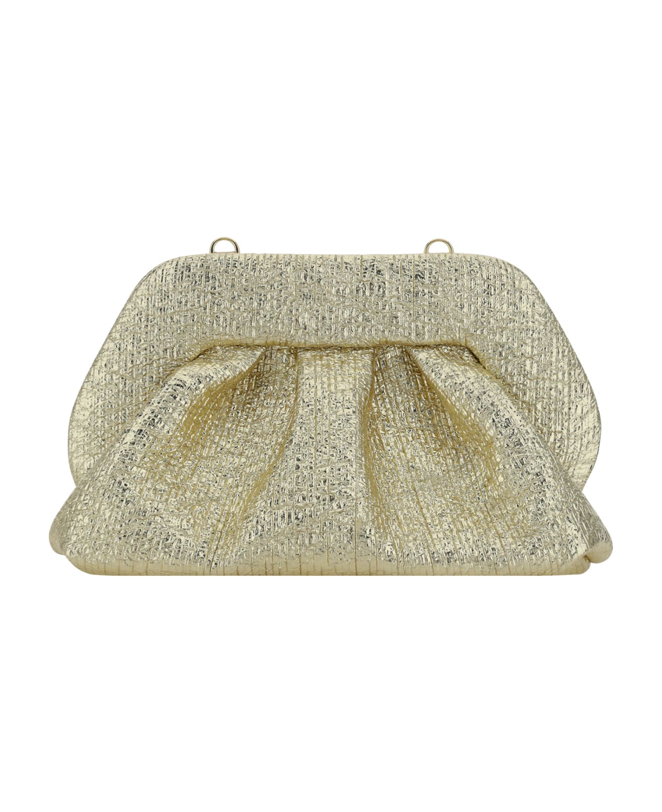 Tia crumpled laminated clucth bag by themoirè, removable and adjustable shoulder strap, magnetic button closure applied at top, monochrome design, single interior compartment.
