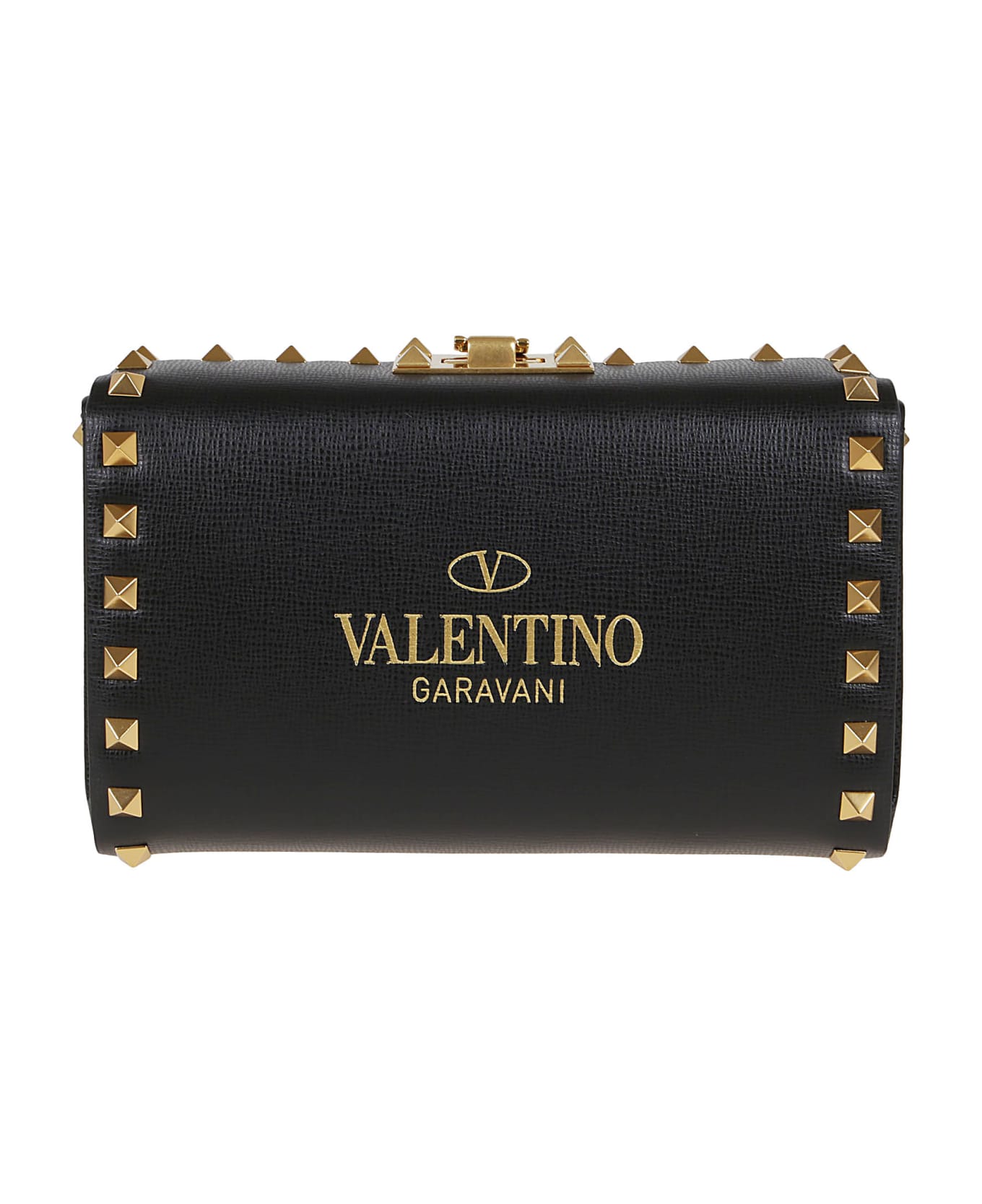 Rockstud Alcove black clutch in grained calfskin BY VALENTINO GARAVANI. Hook closure. Characterized and embellished along the perimeter by studs, features of the antique brass-colored brand like the other metal parts and VALENTINO GARAVANI signature with logo on the front. The bag can be carried either by hand or on the shoulder thanks to the chain characterized by the iconic studs or shoulder strap thanks to the adjustable and removable leather shoulder strap. Ideal to be worn with both a casual outfit and an elegant outfit, for a suit with pure femininity and a deeply provocative attitude characteristic of the Valentino Garavani Rockstud Alcove collection!