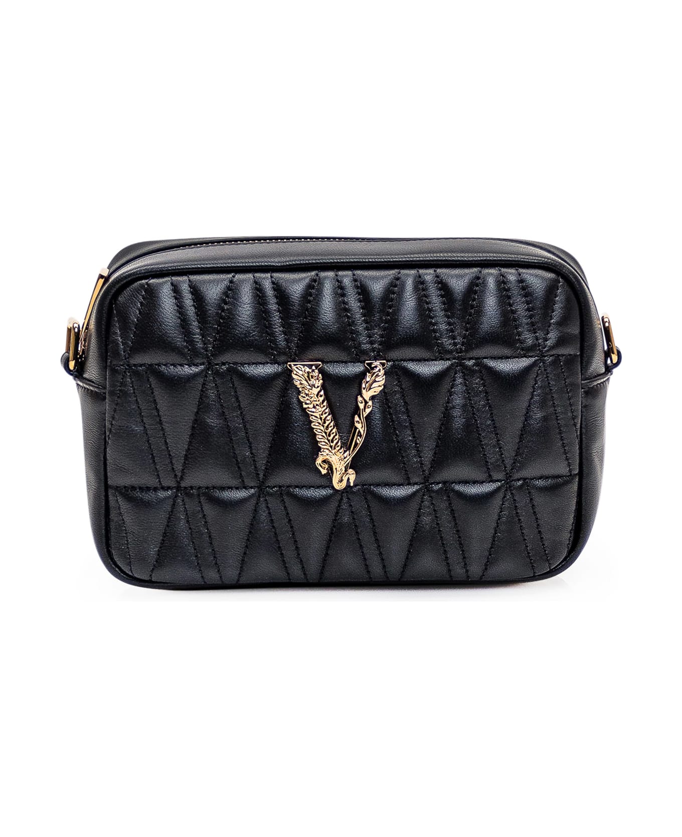 Black leather shoulder bag with quilted effect. Removable shoulder strap. Inside flat pocket. Zip closure. Flat pocket on the back. Baroque V golden logo on the front. Composition: Outside: 100% Lambskin Lining: 90% Cotton, 10% Acrilico