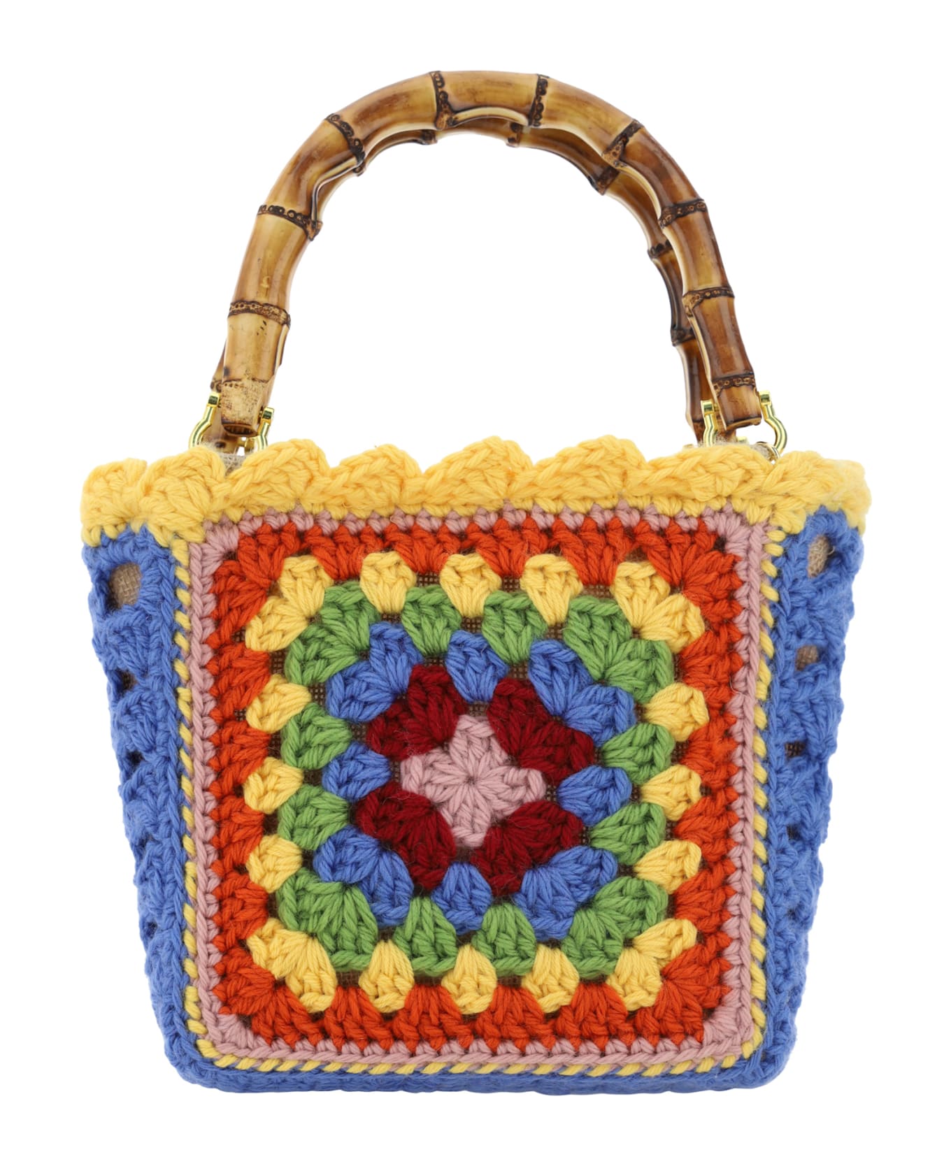 Wool hand bag by la milanesa, multicolored crochet pattern, double rigid bamboo handles, single interior compartment, iconic brand signature patch embroidered inside.