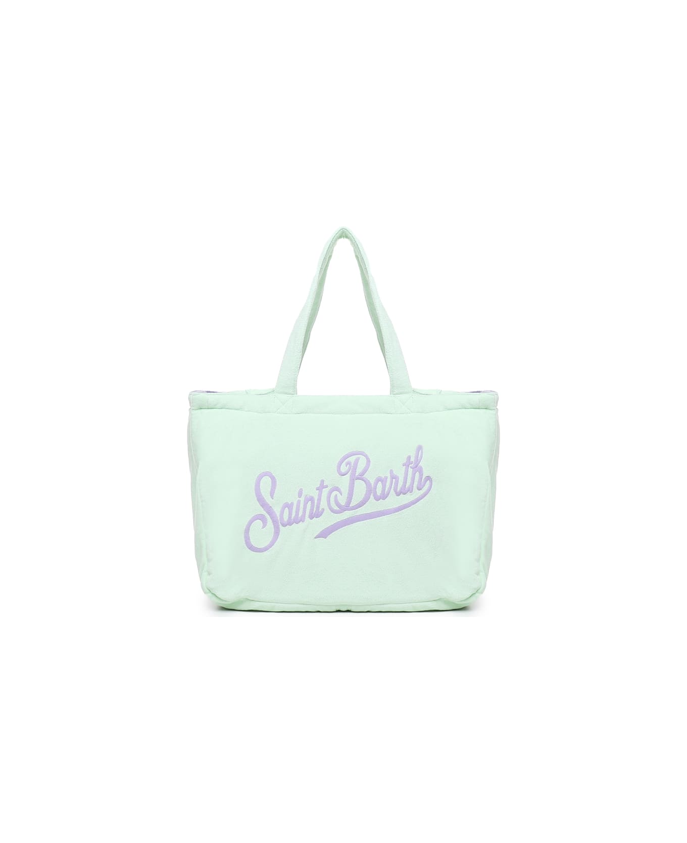 -Double beach bag -Spacious interior -Double-sided sponge tote bag -Teal terry fabric on one side -Exclusive Saint Barth logo embroidery -Lilac checked print on cotton fabric inside -Hidden pocket on the cotton side -Drawstring closure -Dimensions: 45 x 34 x 19 cm -Colour: Aqua green, lilac