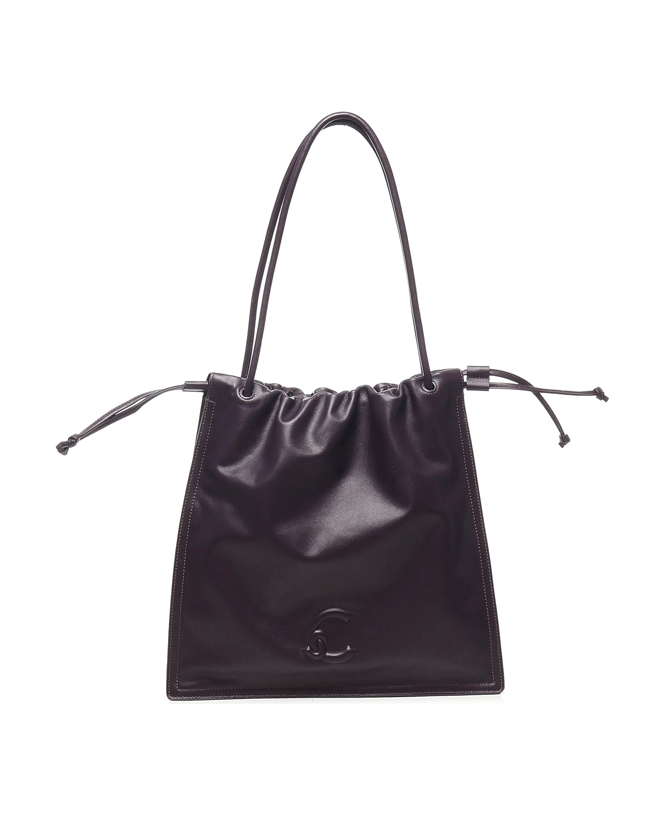 -Made of smooth leather -Magnet closure -Side drawstrings -Gold stamp logo -Three internal pockets -Dimensions: 40 x 36 x 11 cm -Color: Plum