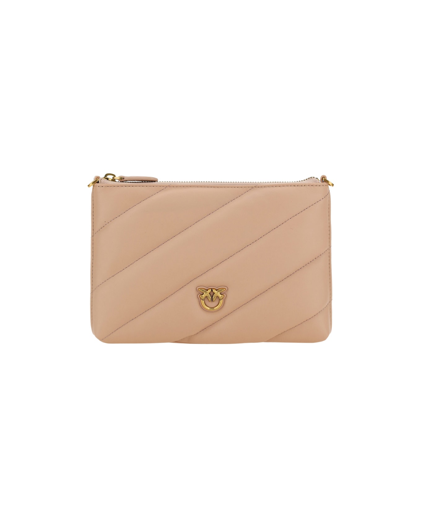 Flat classic bag by pinko, top zipper closure, removable sliding chain shoulder strap, quilted design with tone-on-tone stitching, iconic love birds brand plaque applique on front, interior zippered welt pocket, interior open.
