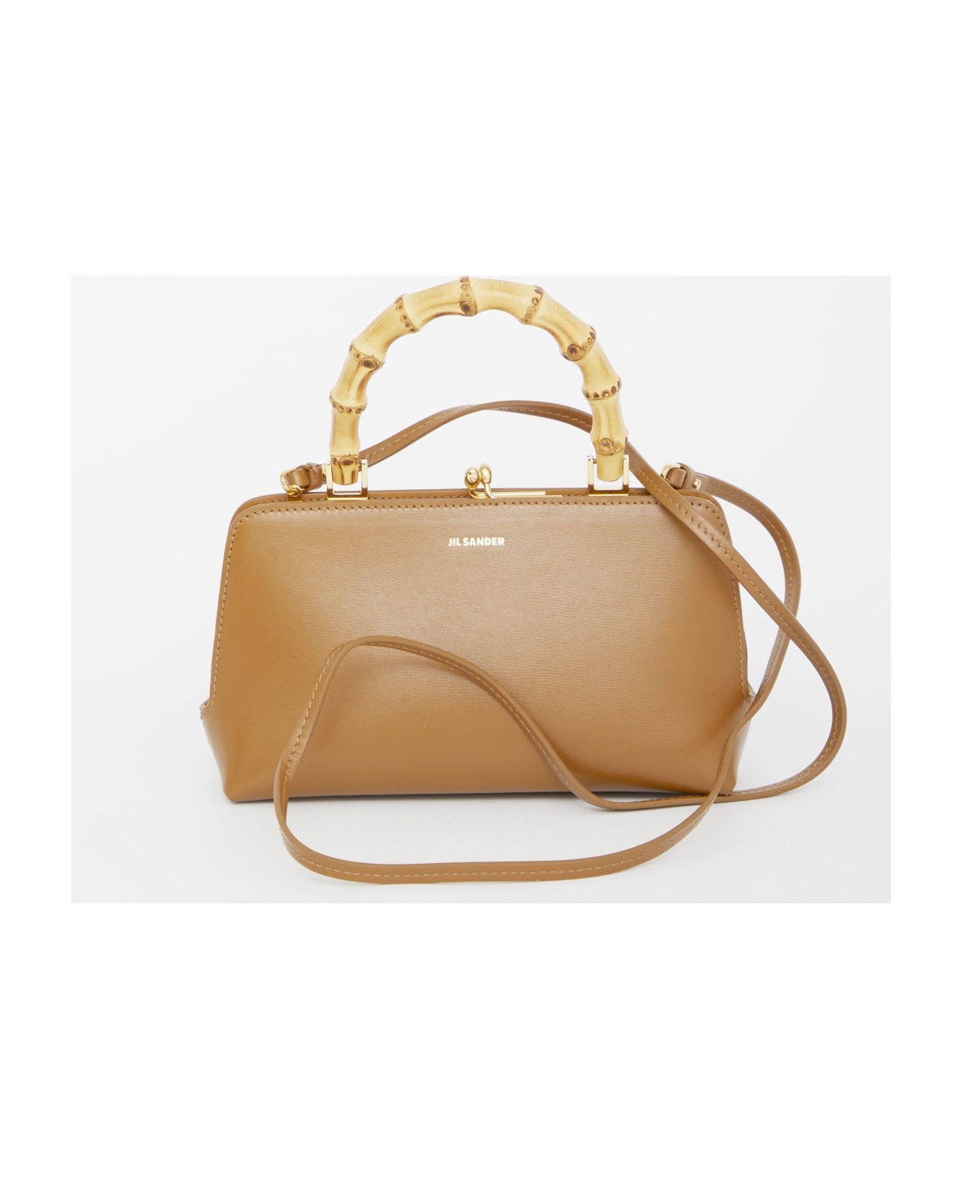 Goji Bamboo mini bag in brown calfskin with embossed Jil Sander logo on the front. It features bamboo handle, adjustable and detachable leather shoulder strap, clutch closure with goji berry detail, one main interior compartment and one interior zip pocket.