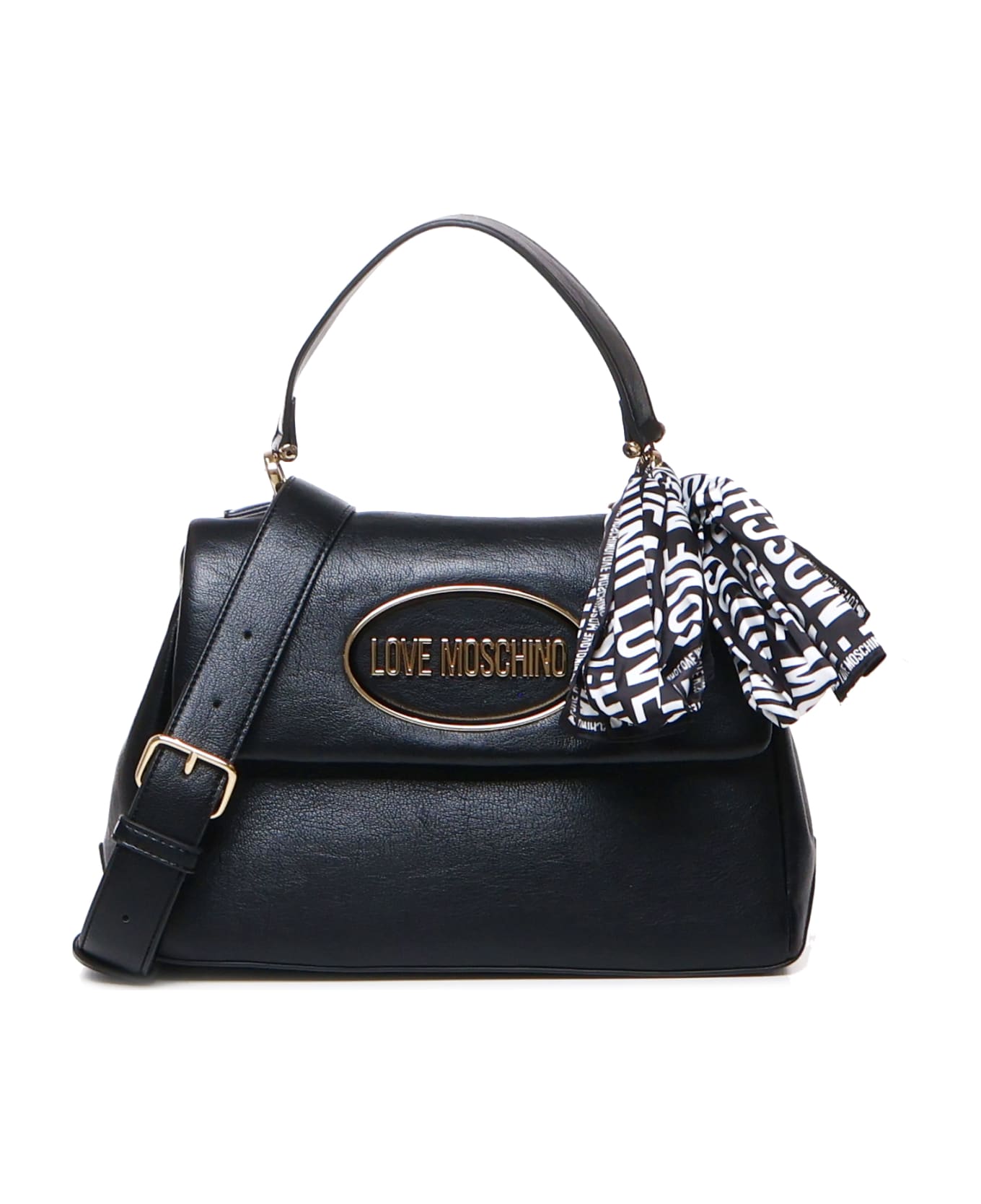 -Handbag -Adjustable and detachable shoulder strap -Flap with magnetic closure -Decorative scarf -Dimensions: 28x19x7 cm -Colour: Black