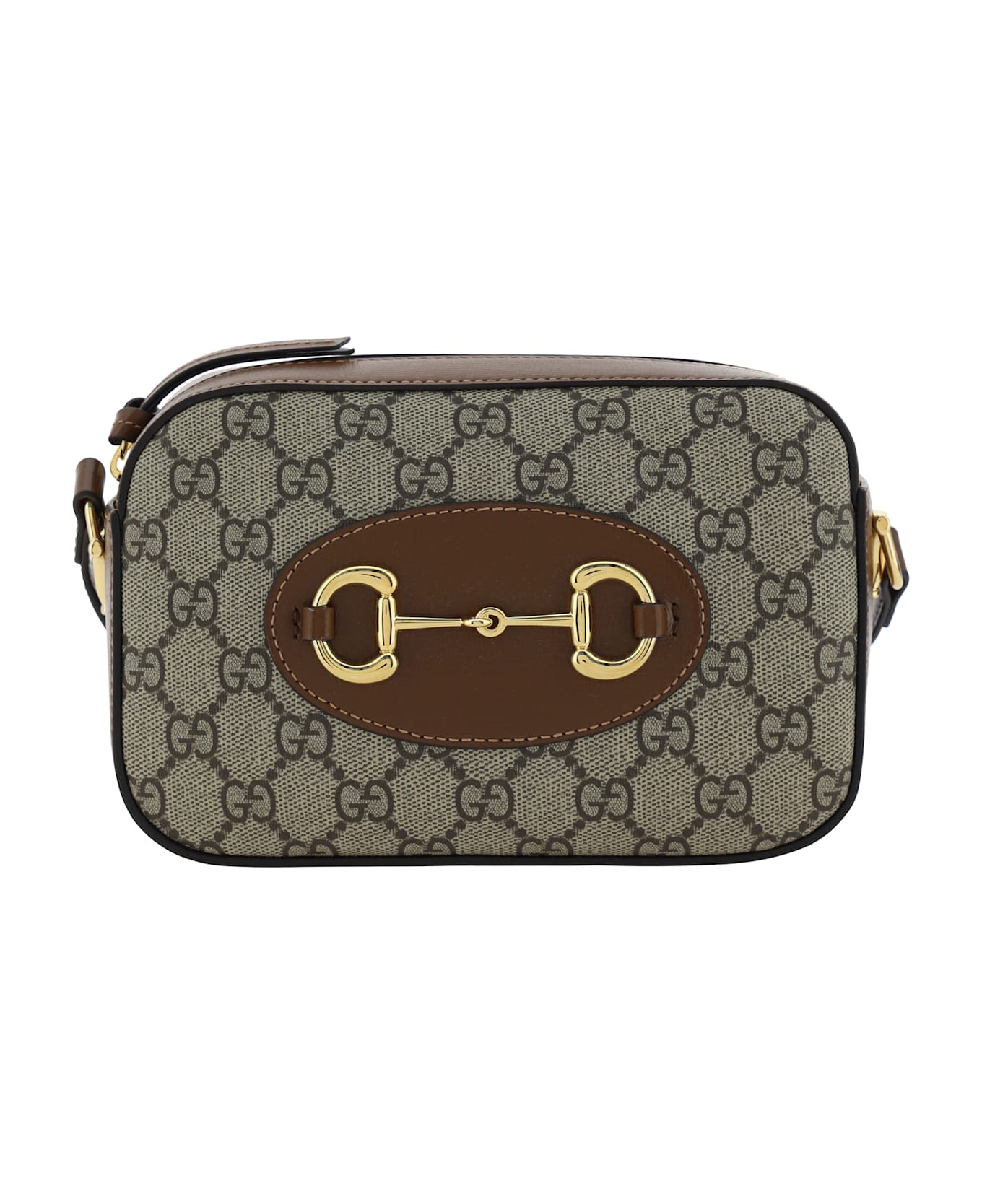 Horsebit 1955 shoulder bag by gucci, contrasting gold-plated horsebit detail applied to the front, top closure by lap zipper, adjustable flat leather shoulder strap, design made of jacquard print fabric and iconic all-over gg supreme pattern, slit pocket on the back.
