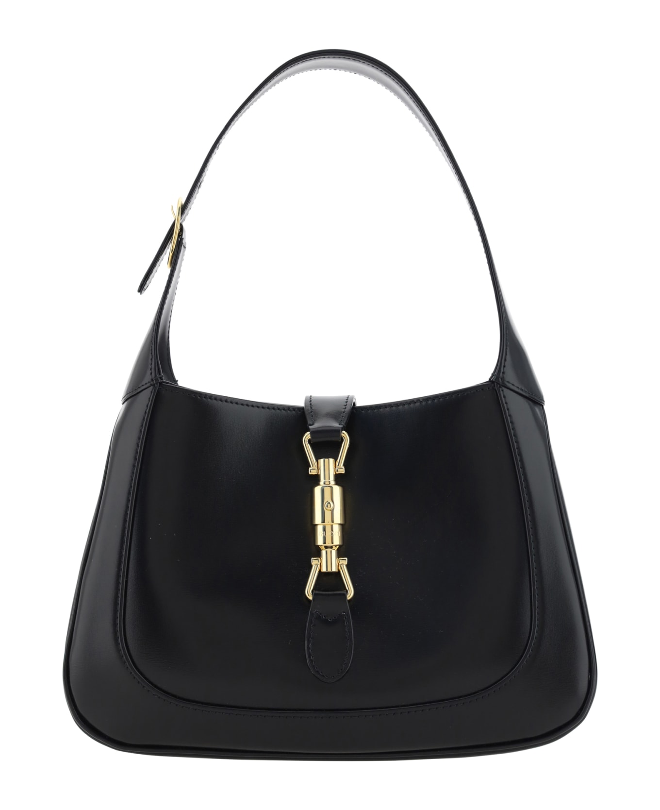Calfskin jackie 1961 handbag by gucci, adjustable flat shoulder strap at top, magnetic flap top closure embellished with the brand's iconic horsebit system, smooth leather design, single interior compartment, interior welt pocket.