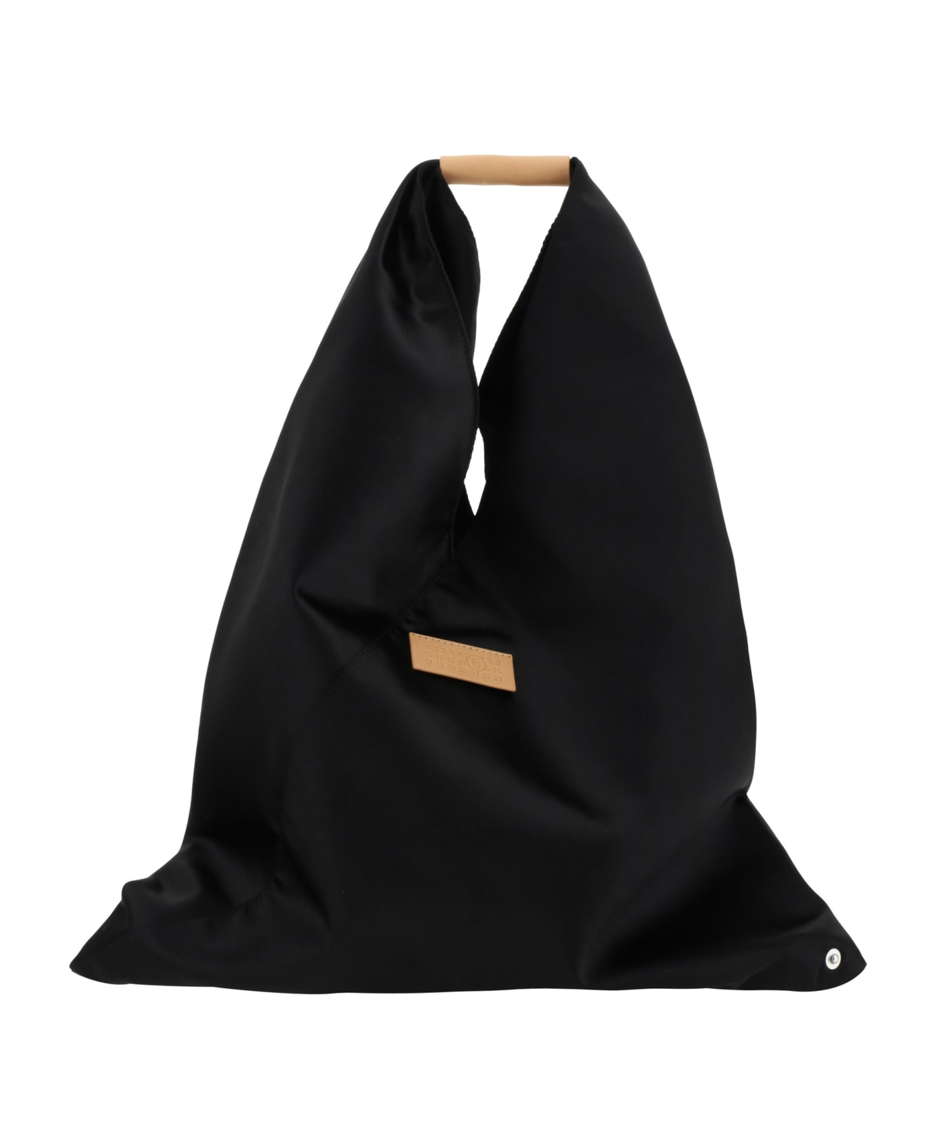 Cotton japanese hand bag by mm6, iconic brand shape, monochrome paneled design, leather detail on handle, iconic embroidered brand signature press-stamped patch on front, single interior compartment, iconic contrasting embroidered brand stitching on back.