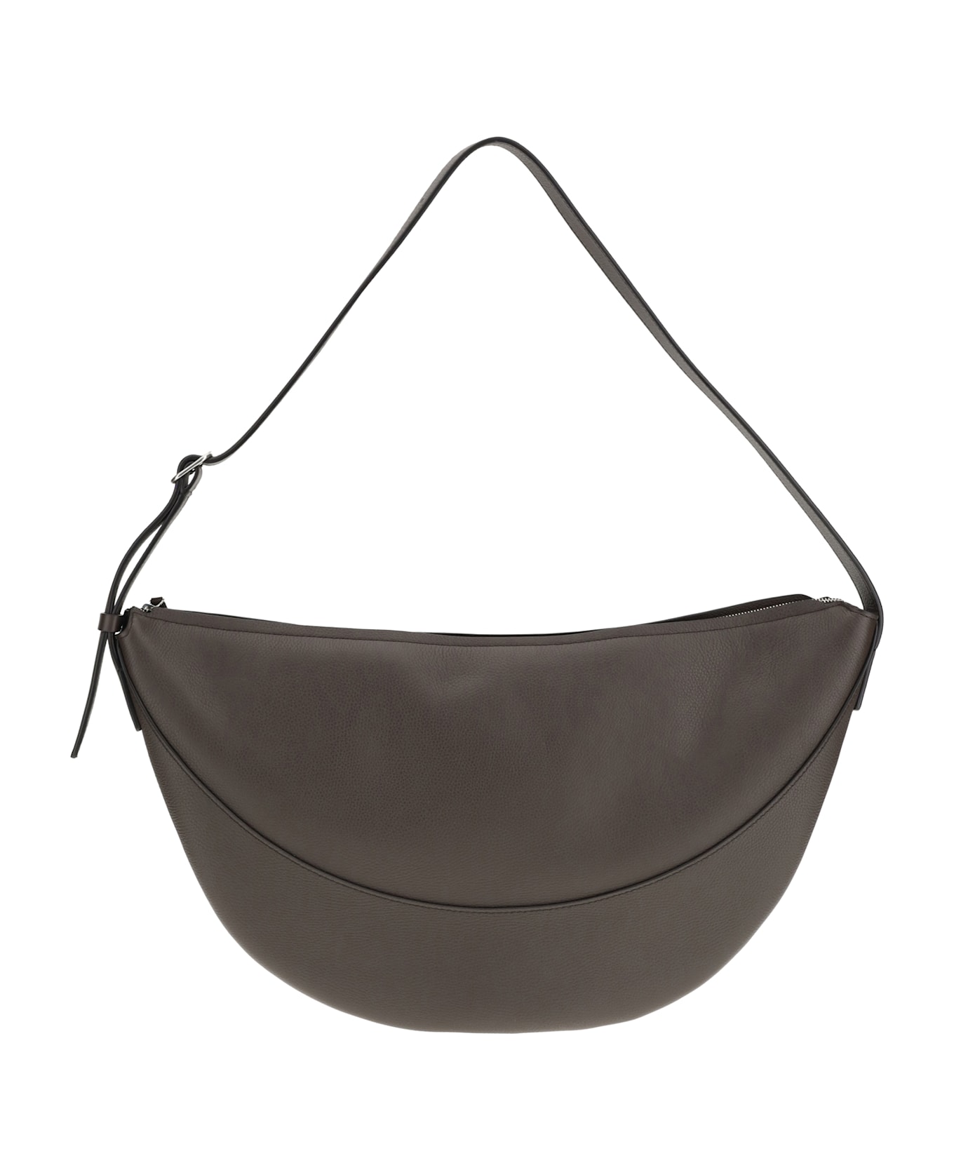 The jouve shoulder bag by the row is a sophisticated accessory with a half-moon design, crafted from high-quality leather. the flat, adjustable shoulder strap ensures comfort and versatility, while the zippered top closure offers security and convenience. perfect for those seeking a balance between elegance and functionality, this bag easily complements any look, adding a touch of understated sophistication.