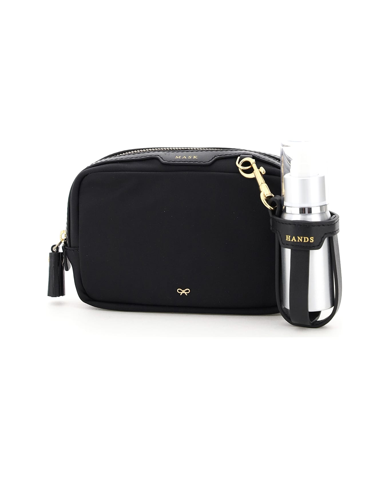 Anya Hindmarch PPE kit consisting of a spray bottle for hand sanitizer with independent case and carabiner, a washable mask in striped fabric with embroidered logo and removable filter, a zip pouch in recycled nylon fabric, zip puller with tassel, the iconic gold-tone metal bow applied on the front and logoed fabric lining with internal pockets for gloves and mask.