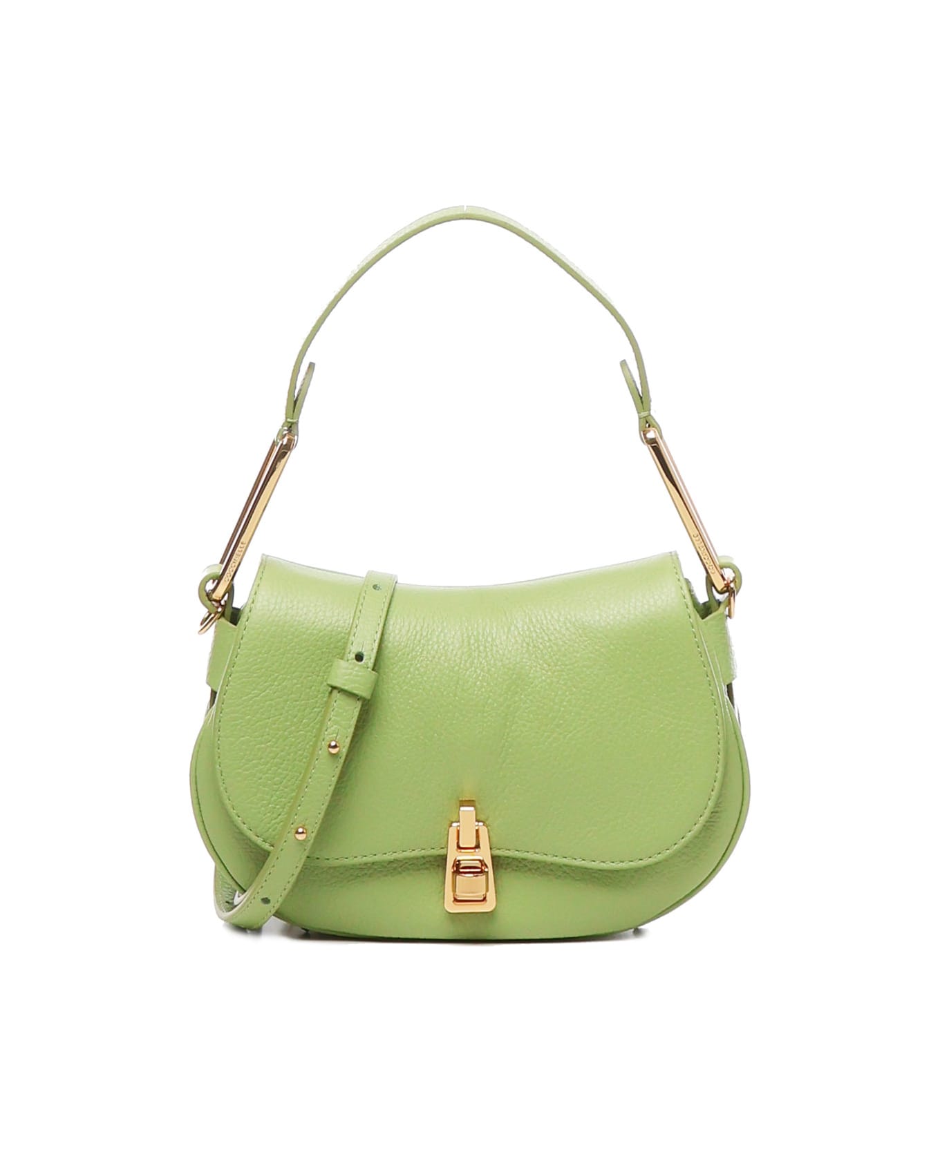 -Made of leather with grain -Swivel closure -Handle forHand carry -Adjustable and removable leather shoulder strap -Interior zippered pocket -Golden galvanic -Logo on accessory -Measurements: 22 x 14 x 4 cm -Color: Green