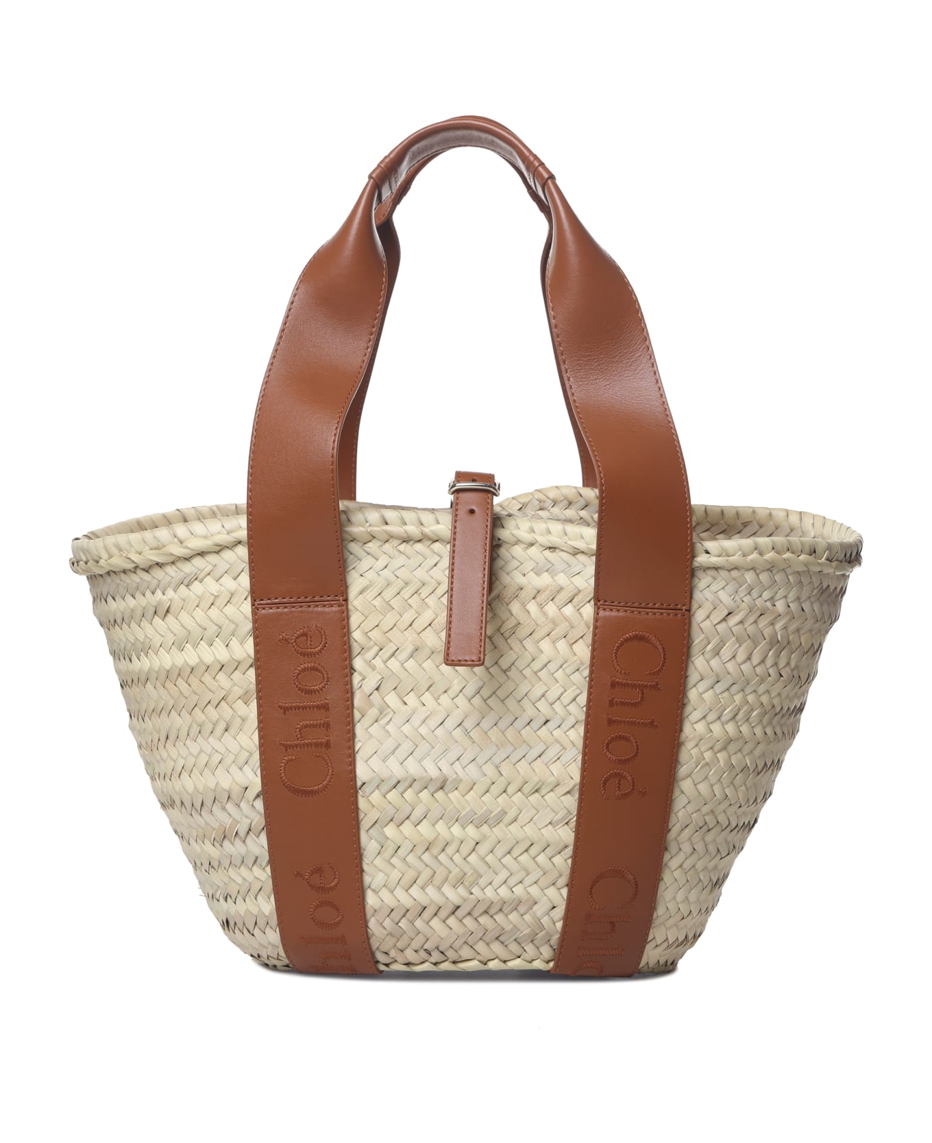 -Medium basket bag in hand-woven raffia and soft calfskin