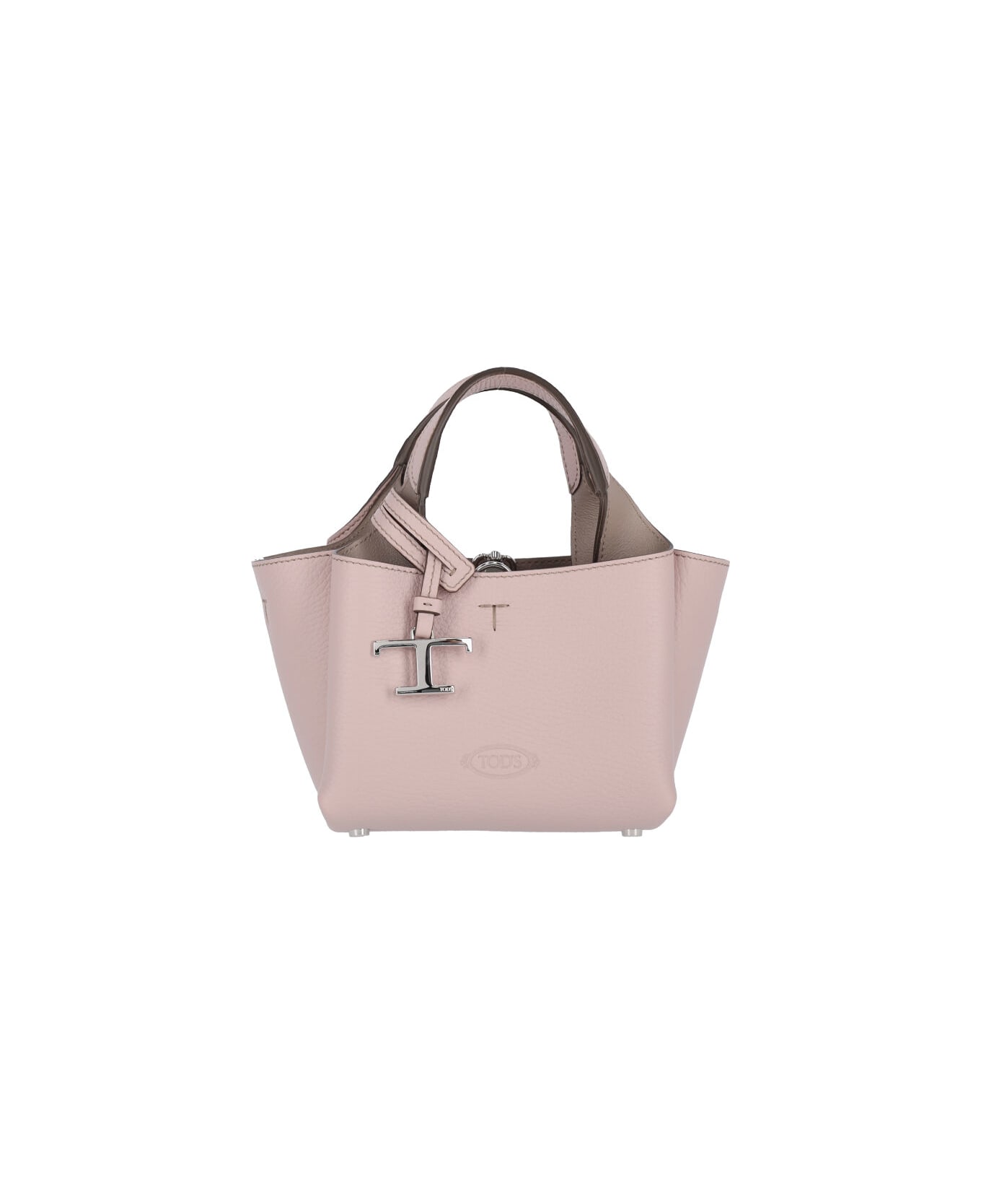 Tod s micro logo bag in taupe hammered calf leather with two handles, removable silver metal "T Timeless" logo charm detail, adjustable and removable shoulder strap, button strap closure, embossed logo on the front, logo stitching on the front and back, two flat inner pockets, three separate inner compartments.