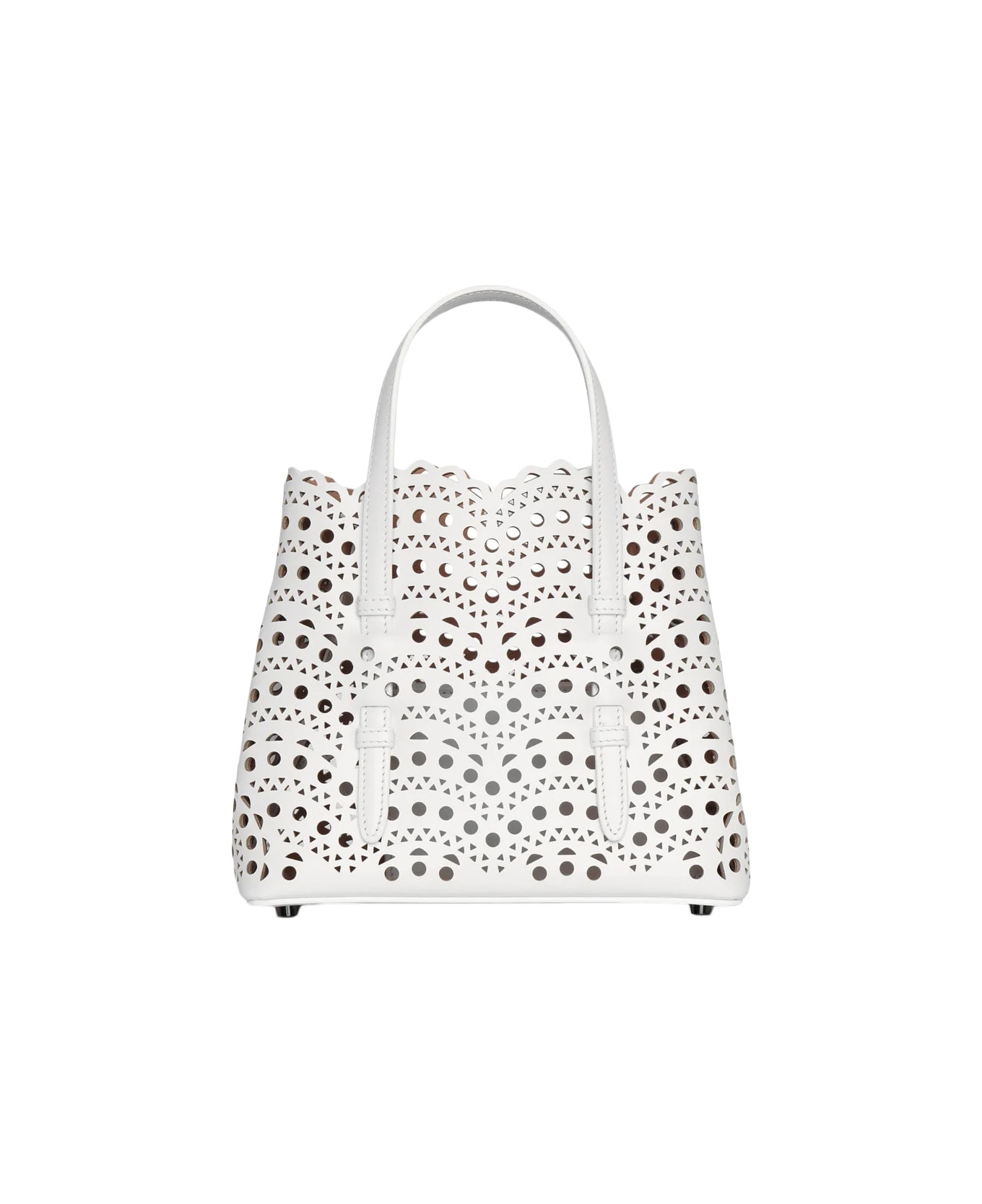 White Mina 20 tote bag by Alaia in calf leather with vienne pattern inspired by precious moucharabieh architectural lace and fretwork, side gusset with expanding snap fastening, galvanised silver hardware, detachable leather pouch, detachable shoulder strap, hand or shoulder carry. Composition: Exterior:, 100% Calf Leather. Lining:, 100% Lambskin.