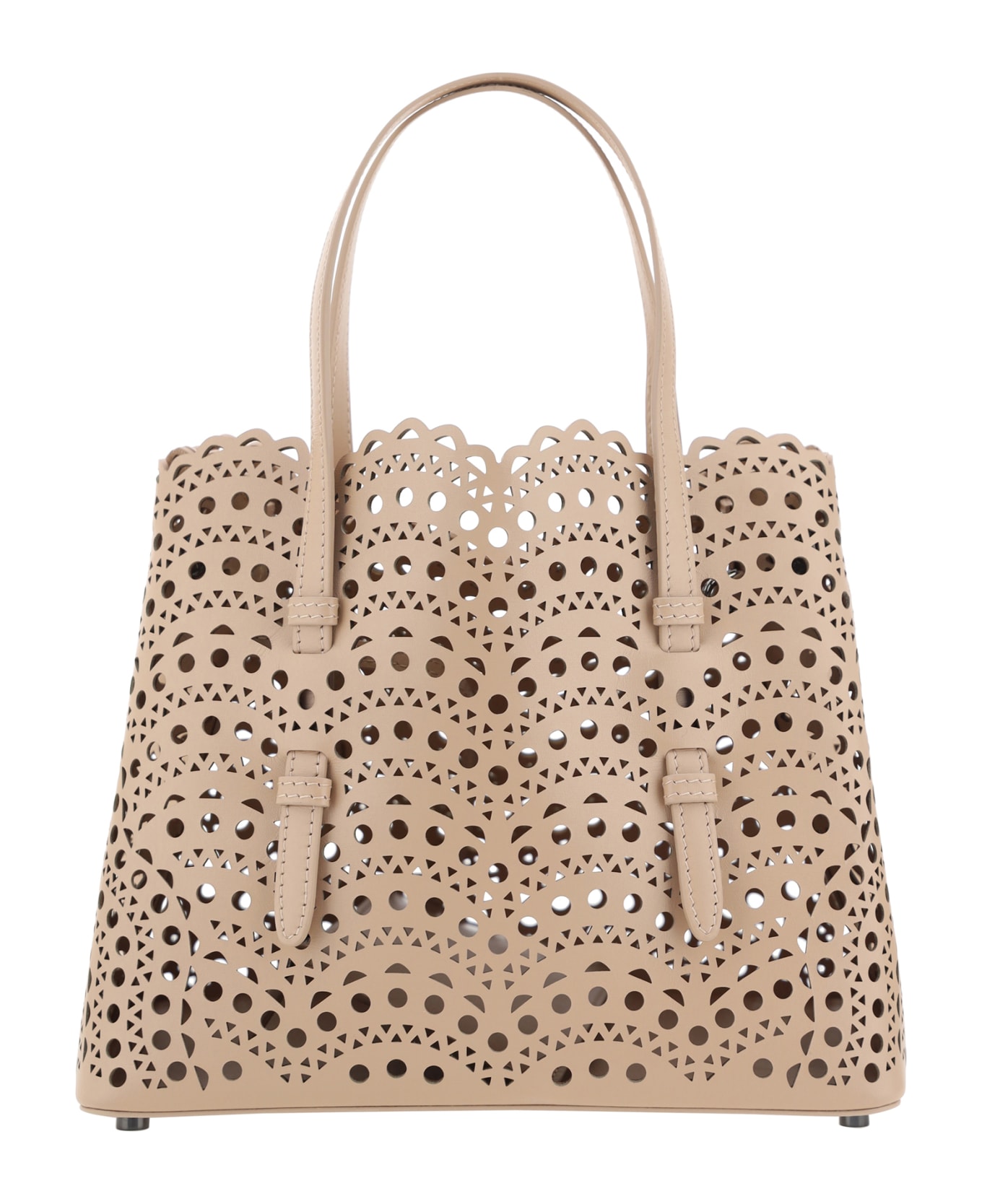 Calfskin mina 25 handbag by alaïa, design with perforated geometric details, two top handles, single interior compartment, adjustable shoulder strap, removable pouch by snap hook, metal support feet attached to base of bag.