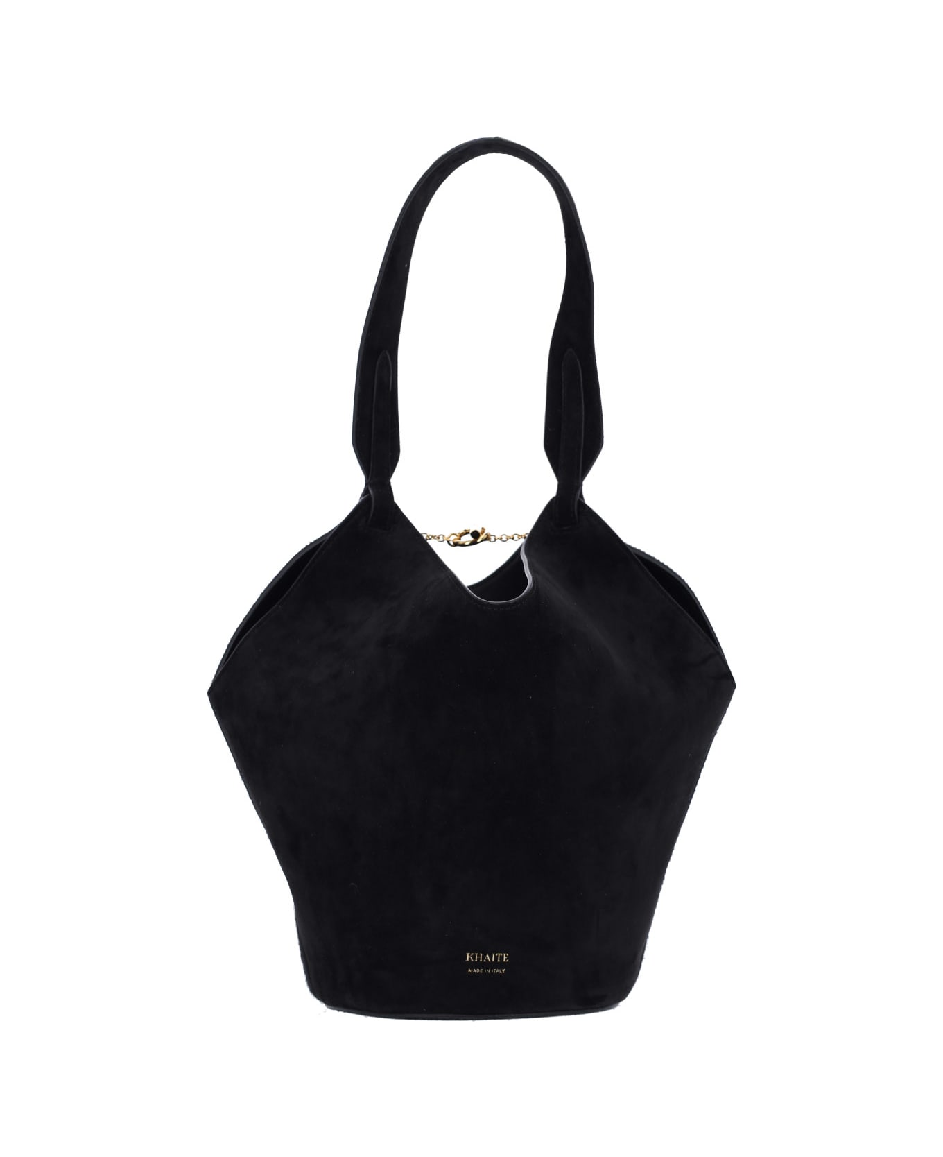 Khaite mini Lotus bag in black calf leather on the front, animal print pattern on the back, top handle, gold metal chain and hook closure, gold logo embossed on the front, and single main inner compartment. Composition: 100% Calf Leather