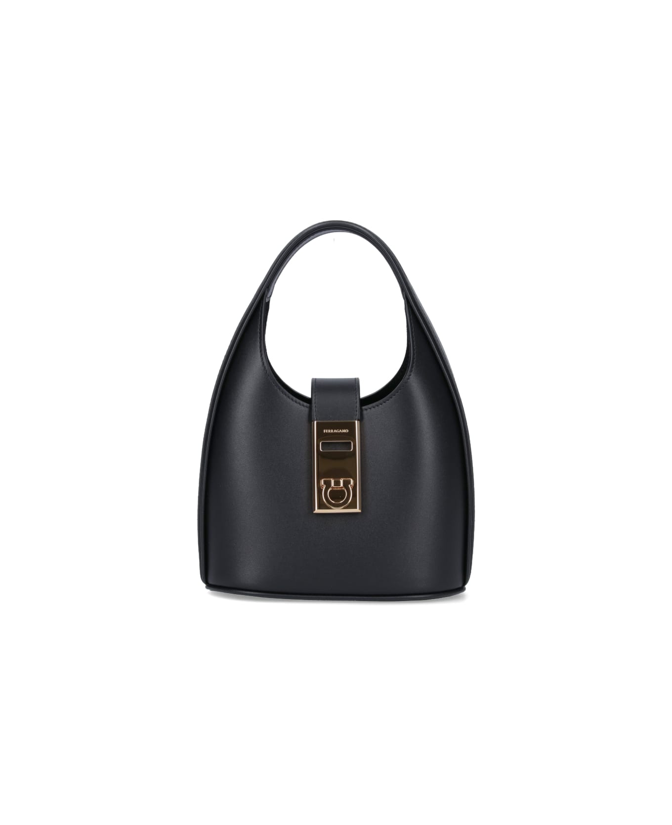 Ferragamo "Gancini" mini hobo bag in black leather, top handle, adjustable and removable shoulder strap, gold logo turn lock and a single interior compartment. Composition: 100% Calf Leather