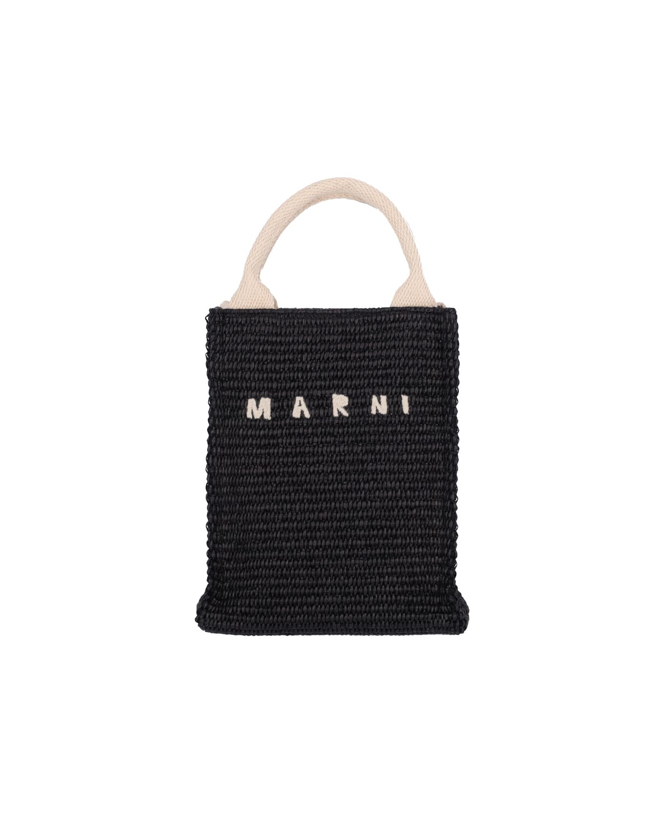 Marni logo mini handbag in black cotton blend with raffia effect, two handles, shoulder strap, contrasting logo embroidery on the front, and a single inner compartment. Composition: 52% Cotton, 48% Polyamide