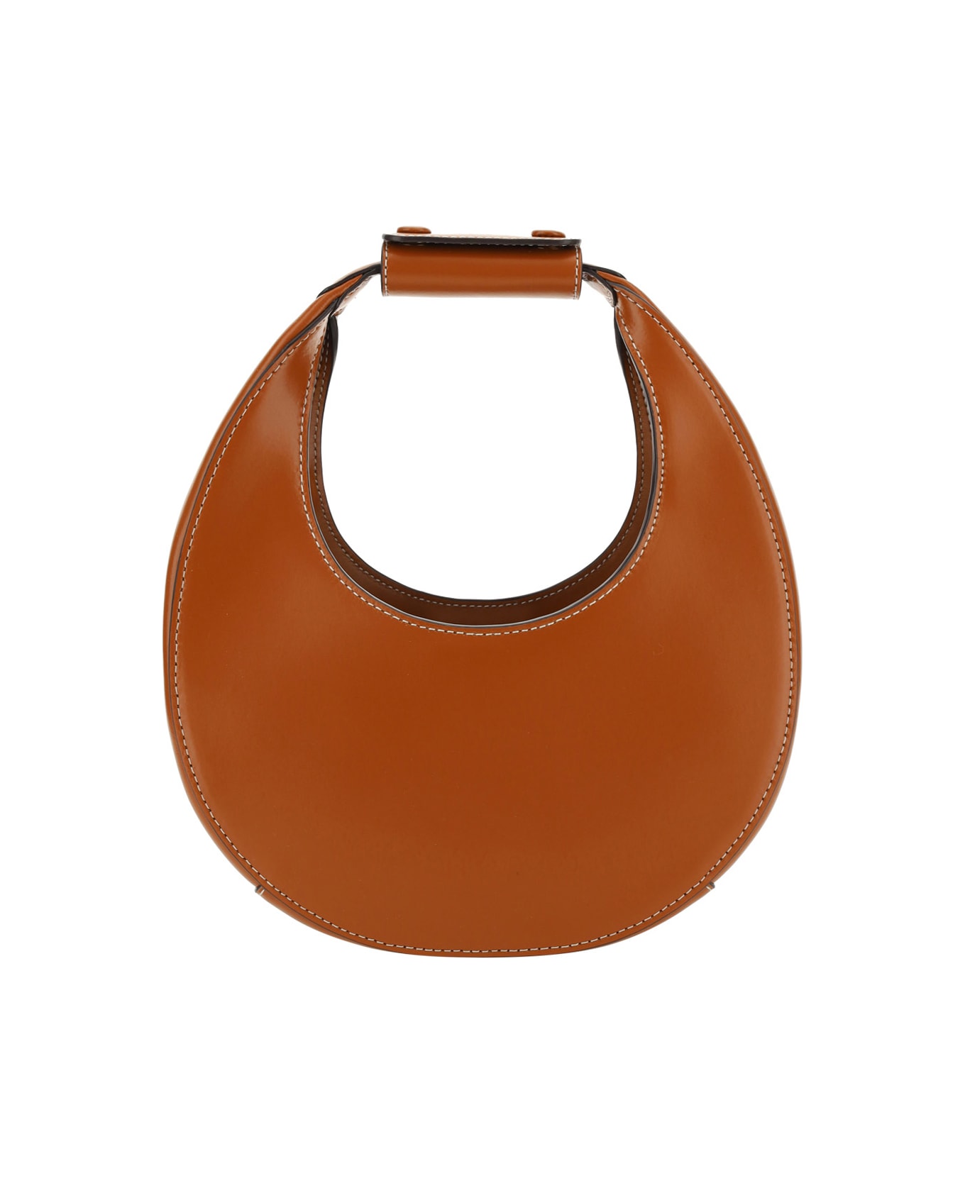 Calfskin mini moon by staud, iconic round moon shape, rigid handle, top closure with magnetic button, iconic brand signature press-stamped on closure flap, interior zippered pocket, removable and adjustable shoulder strap.